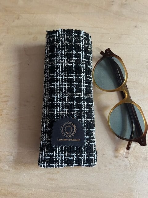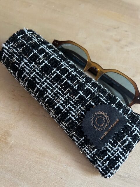 Brillenhoesje van chique Sjanel black met zilverdraad. Aan de binnenzijde bekleed met zwart vilt. Je kan ook een andere kleur kiezen als je dat wilt, als ik de kleur niet heb, stuur ik een berichtje. Je kan dit hippe hoesje natuurlijk ook gebruiken voor je zonnebril. Past bovendien heel gemakkelijk in je handtas, doordat het niet zoveel ruimte inneemt als een harde brillenkoker.