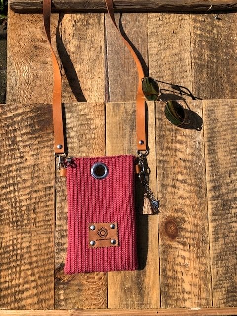 Cross-over festivaltasje van koraalrode gebreide stof. Voorzien van een lang hengsel zodat je het schuin om je schouder kan dragen. Aan de binnenkant verstevigd met vilt. Heel handig als je een feestje hebt, of naar een festival gaat en geen grote tas wilt meenemen. Het schoudertasje draagt lekker ligt. Het tasje is groot genoeg voor het opbergen van je mobiel, lippenstift, en kleine portemonnee. Het hengsel is ongeveer 130 cm. Maar als je dat langer of korter wilt, kan dat! De sleutelhanger krijg je erbij!