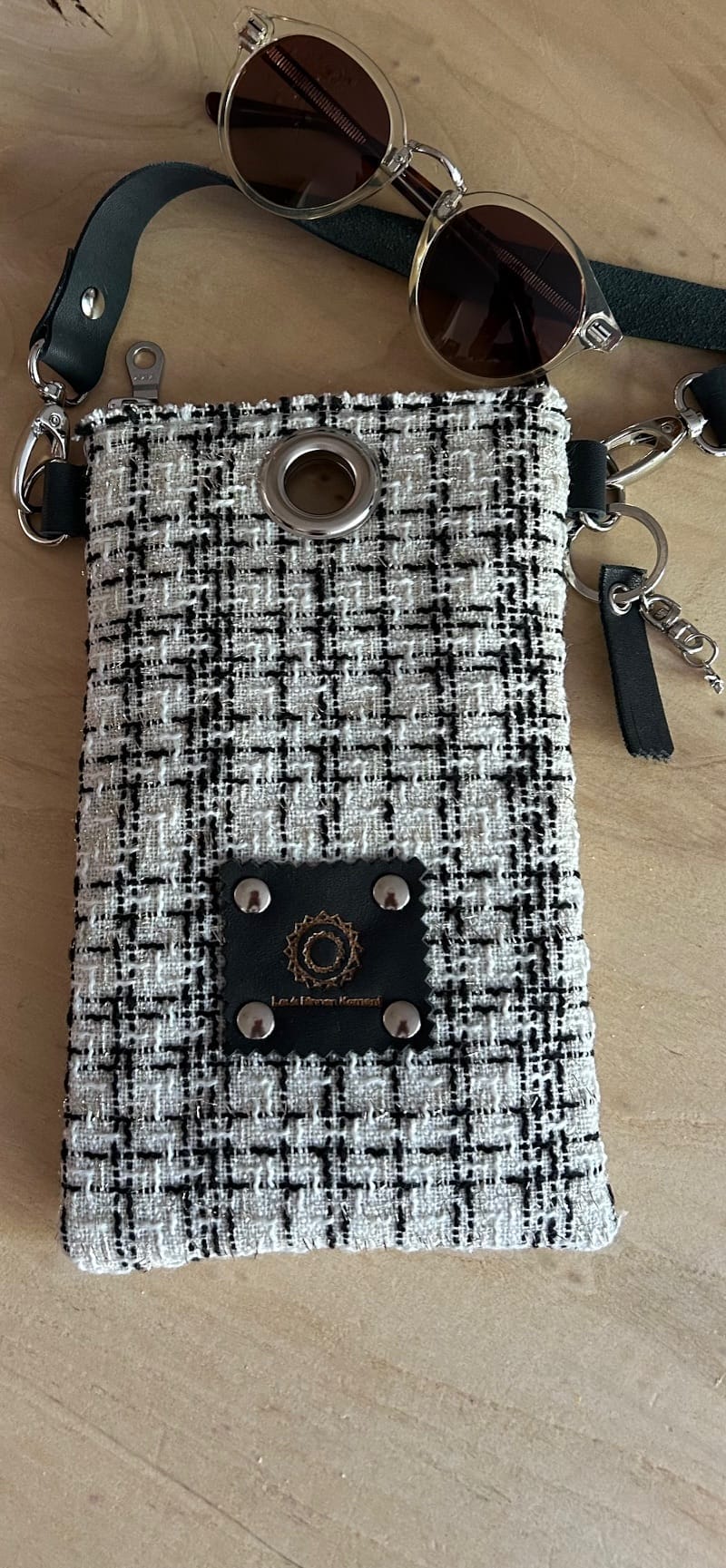 Cross-over festivaltasje van Sjanel off white met zilver. Een mooie geweven stof in off white en zwarte en zilverdraad erdoor waardoor het tasje een chique uitstraling krijgt. Het hengsel is ongeveer 120 cm lang zodat je het tasje schuin om kan doen. Er is ruimte voor je telefoon, lippenstift en eventueel een bril. De sleutelhanger krijg je erbij! Wil je het hengsel korter of langer, zet er dan even bij hoe lang deze wil.