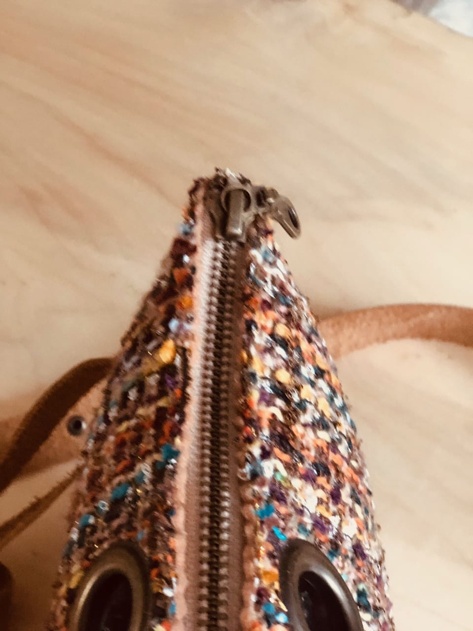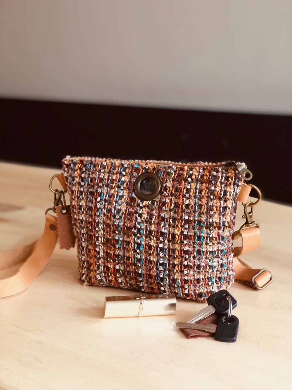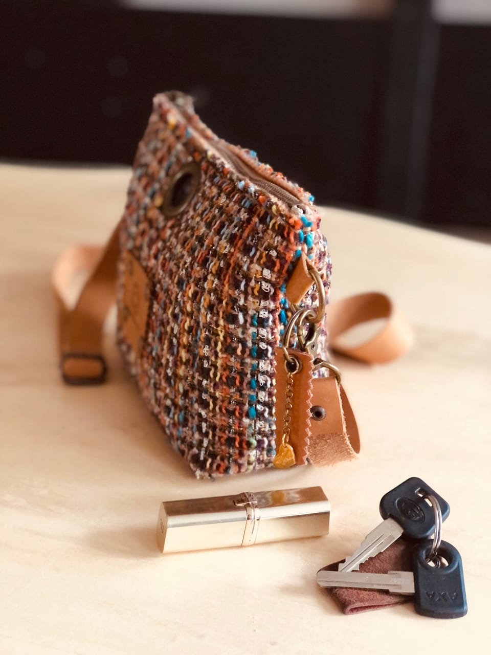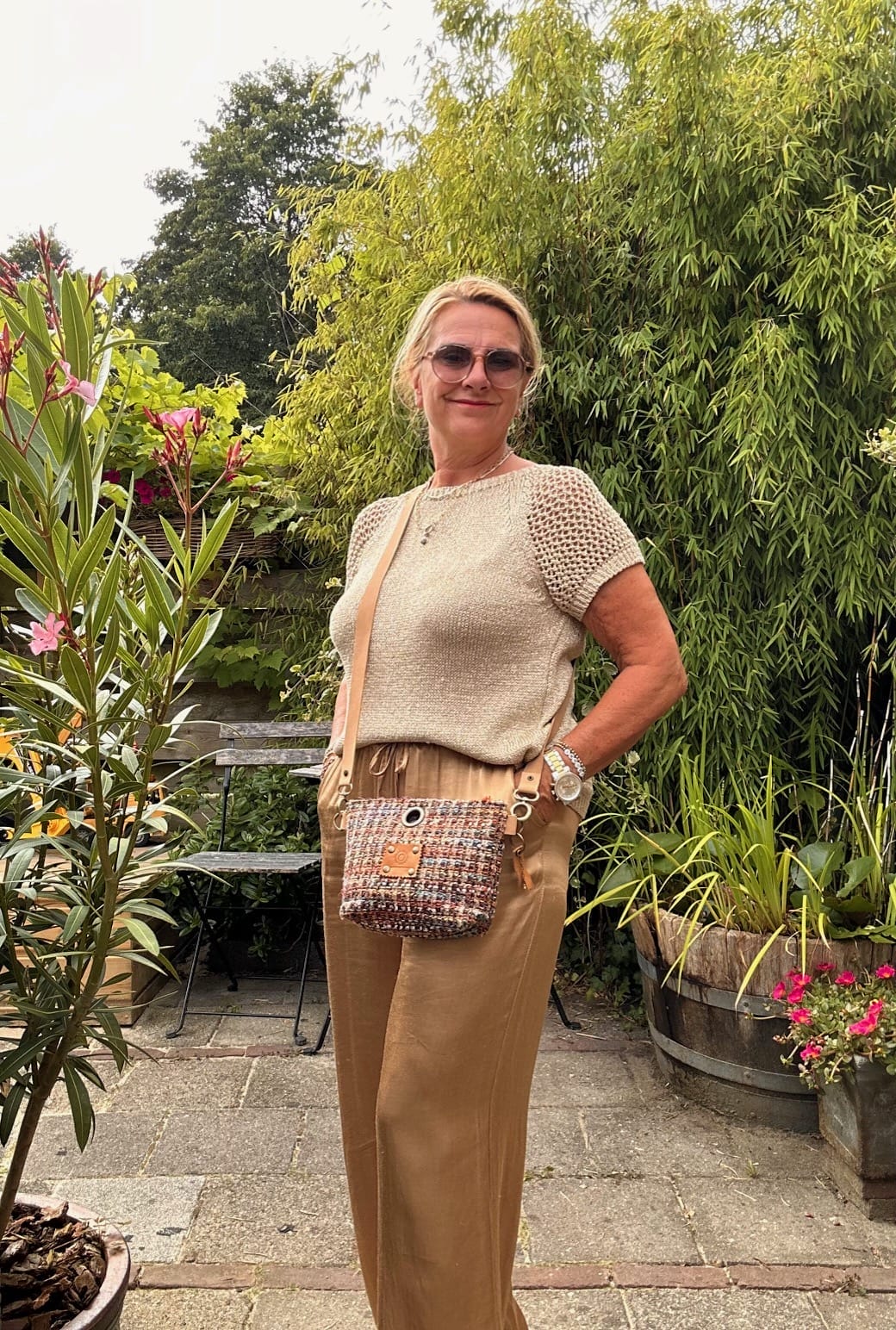 Cross-over schoudertas van chique bruine Sjanellio. Aan de bovenkant zit een rits, en er is ook nog ruimte voor je telefoon, klein portemonneetje, lippenstift, en eventueel een bril. De onderkant hebben we wat breder gemaakt ± 5 á 6 cm, lekker overzichtelijk dus. De sleutelhanger krijg je erbij! De riem is verstelbaar, je kan het tasje ook als fannypack dragen.