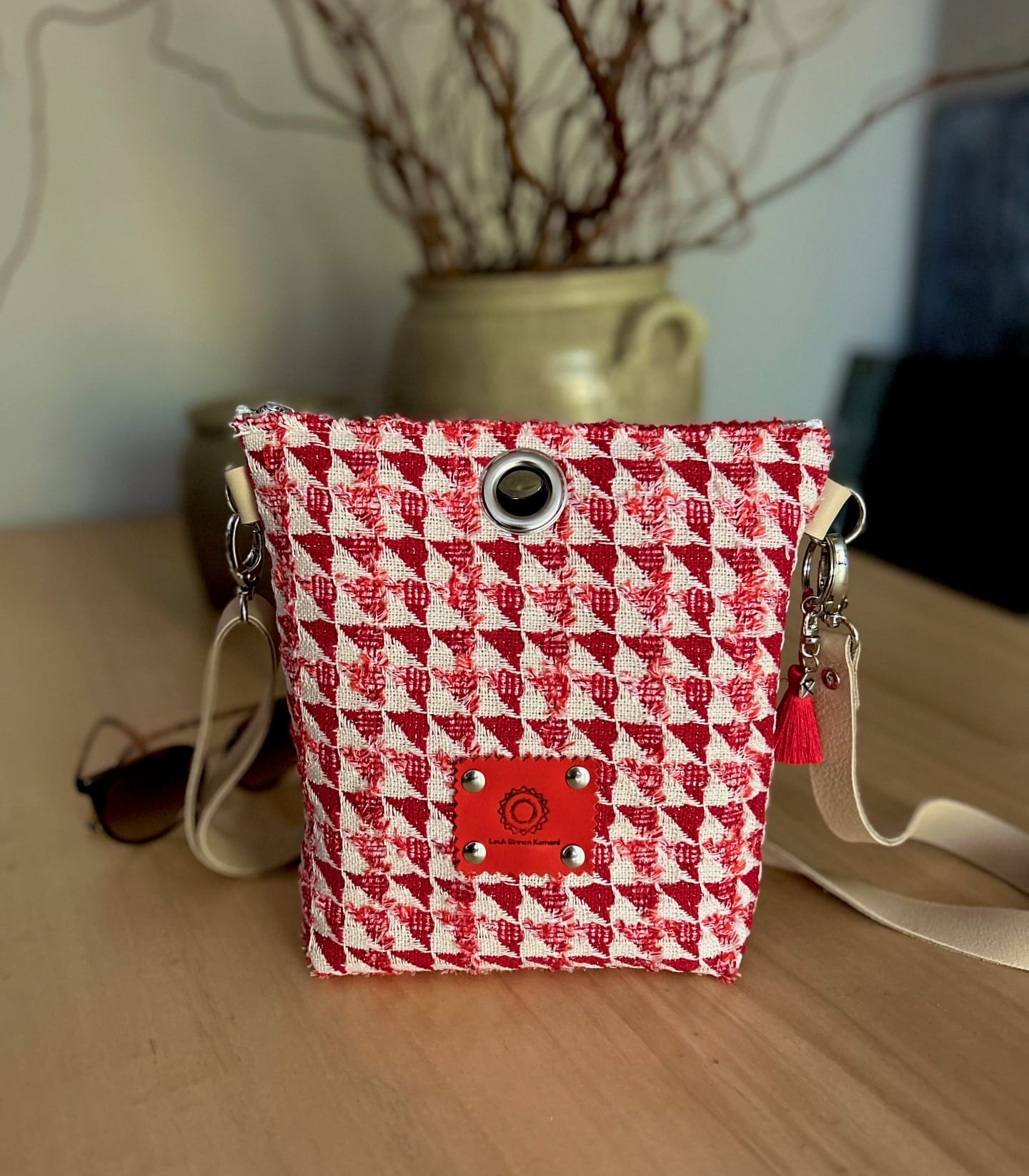 Cross-over schoudertas XL van chique Sjanelli Red Flag. Een mooie geweven stof in rood, off white en een klein zilverdraadje erdoor. Deze versie heeft dezelfde breedte als onze heuptasjes, maar is dieper zodat er eventueel een flesje water in mee kan. Aan de bovenkant zit een rits, en er is ook nog ruimte voor je telefoon, klein portemonneetje, lippenstift, en eventueel een bril. De onderkant hebben we wat breder gemaakt ± 5 á 6 cm, lekker overzichtelijk dus. De sleutelhanger krijg je erbij! De riemlengte maken we op ongeveer 120cm. Wil je langer of korter, dan kan dat natuurlijk!