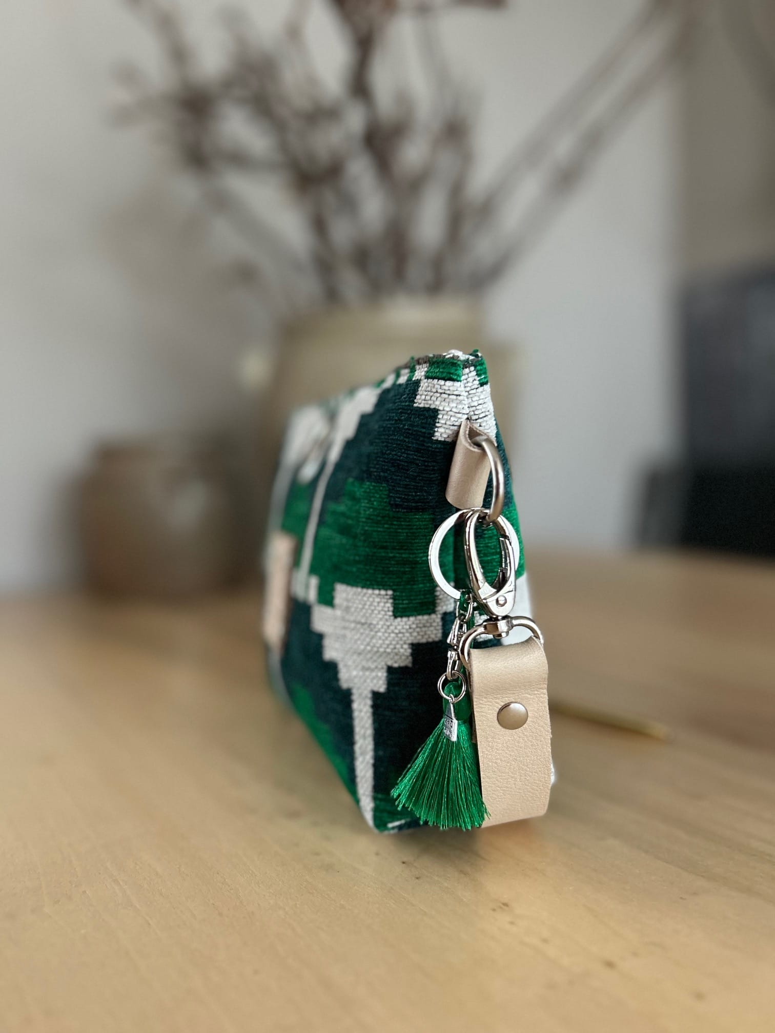Cross-over tas van velours in een groene grafische print met verstelbare leren riem. Een heel mooie zachte stof met leuke patronen erin. Je kan de riem langer en korter maken. Aan de bovenkant zit een ritsje. Er is ruimte voor je telefoon, klein portemonneetje, lippenstift, en eventueel een bril. De onderkant is wat wat breder gemaakt ± 3 á 4 cm, lekker overzichtelijk dus. De sleutelhanger krijg je erbij!