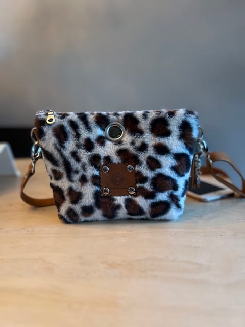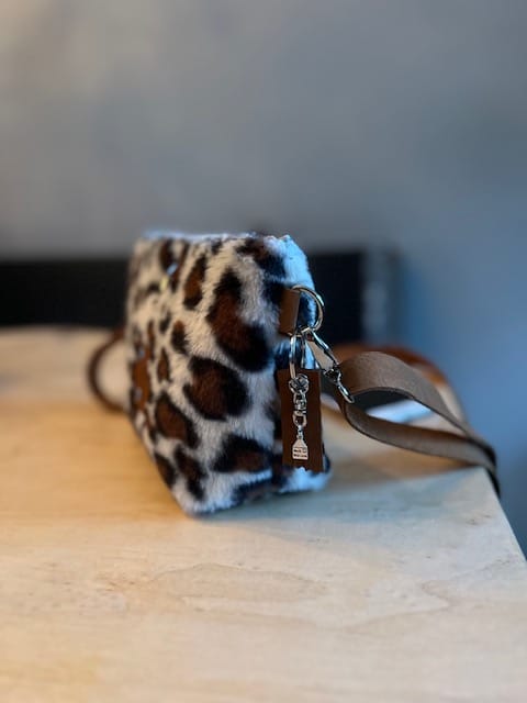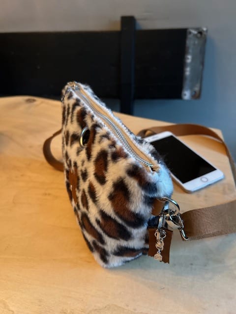 Cross-over tas van zandkleurige fake fur panter met verstelbare leren riem. Een heerlijk zachte fake bont in leuke panterprint. Je kan de riem langer en korter maken. Het tasje kan ook als heuptas gedragen worden, geef dan je heupmaat even door. Aan de bovenkant zit een rits. Er is ruimte voor je telefoon, klein portemonneetje, lippenstift, en eventueel een bril. De onderkant is wat wat breder gemaakt ± 4 á 5 cm, lekker overzichtelijk dus.