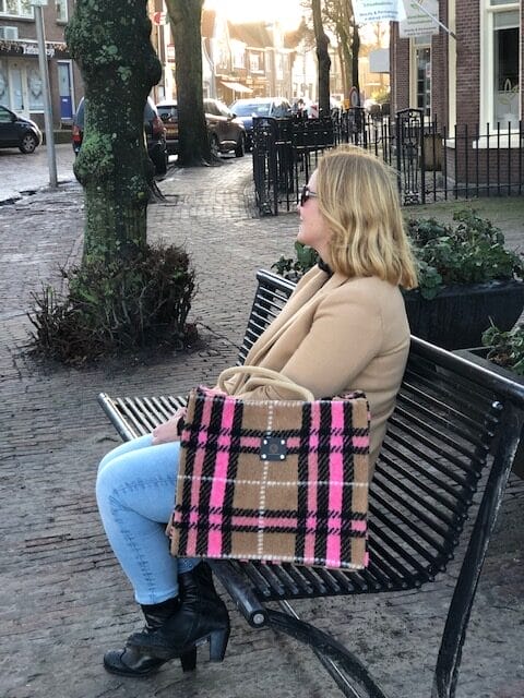 Duurzame jute shopper bekleed met geruite coocked wool Valentina. Supertoffe wollen stof met ruiten in camel, donkerroze, en zwart. Draagt heel licht, en is zeker geen zware tas! De tas is uitgevoerd met luxe katoenen gewatteerde hengsels van 70 cm voor optimaal draagcomfort. Bovendien heeft de tas een handig vakje met ritsje aan de binnenkant voor het opbergen van je portemonnee of mobiel.