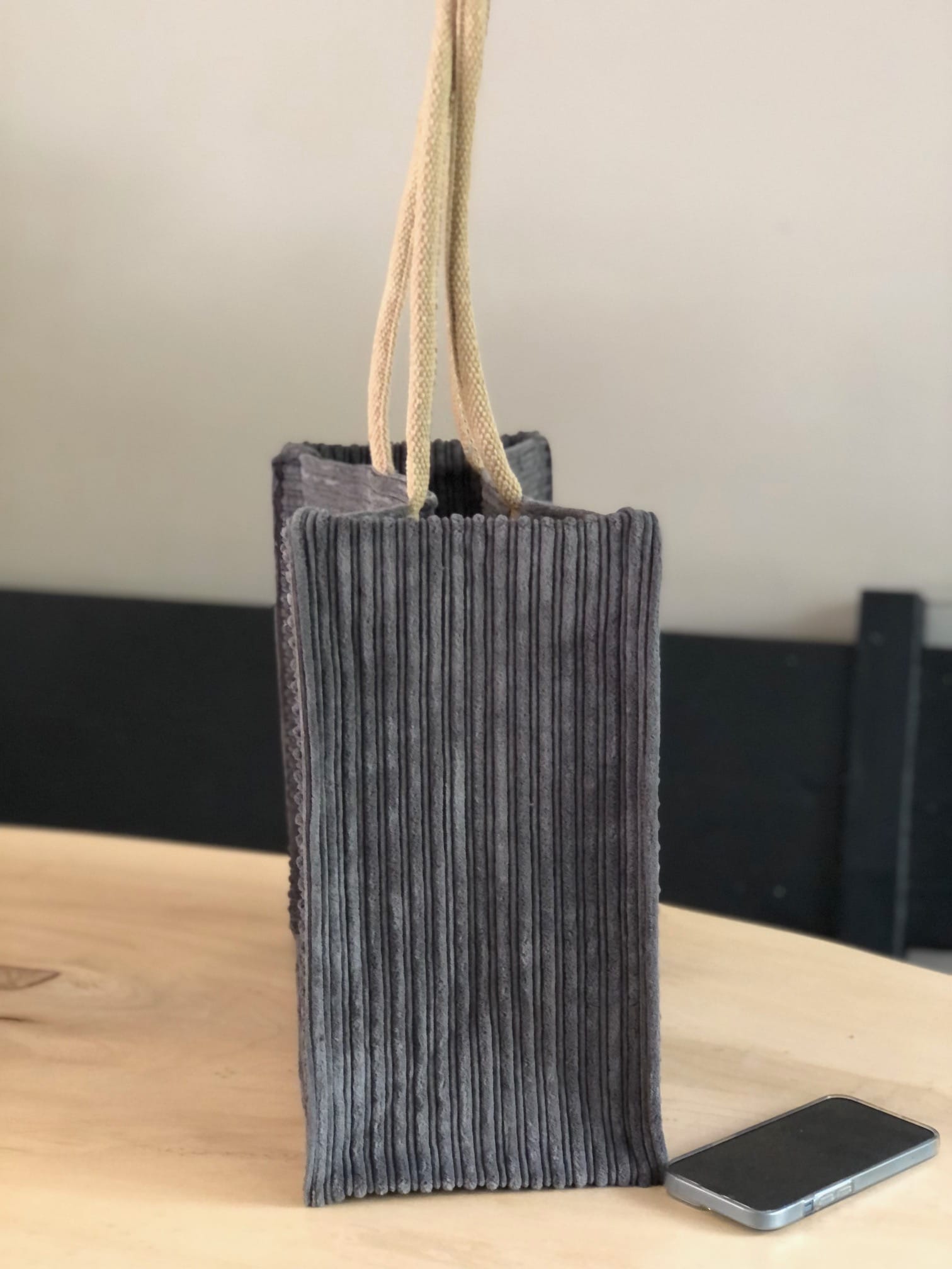 Duurzame jute shopper bekleed met grijze extra brede corduroy . Echt een hele mooie stoere tas met extra brede ribcord. De tas is uitgevoerd met luxe katoenen gewatteerde hengsels van 70 cm voor optimaal draagcomfort. Aan de binnenkant zit een handig vakje met rits voor het opbergen van je portemonnaie of mobiel. Een mooie eenvoudige look, als je niet zo van toeters en bellen houdt.