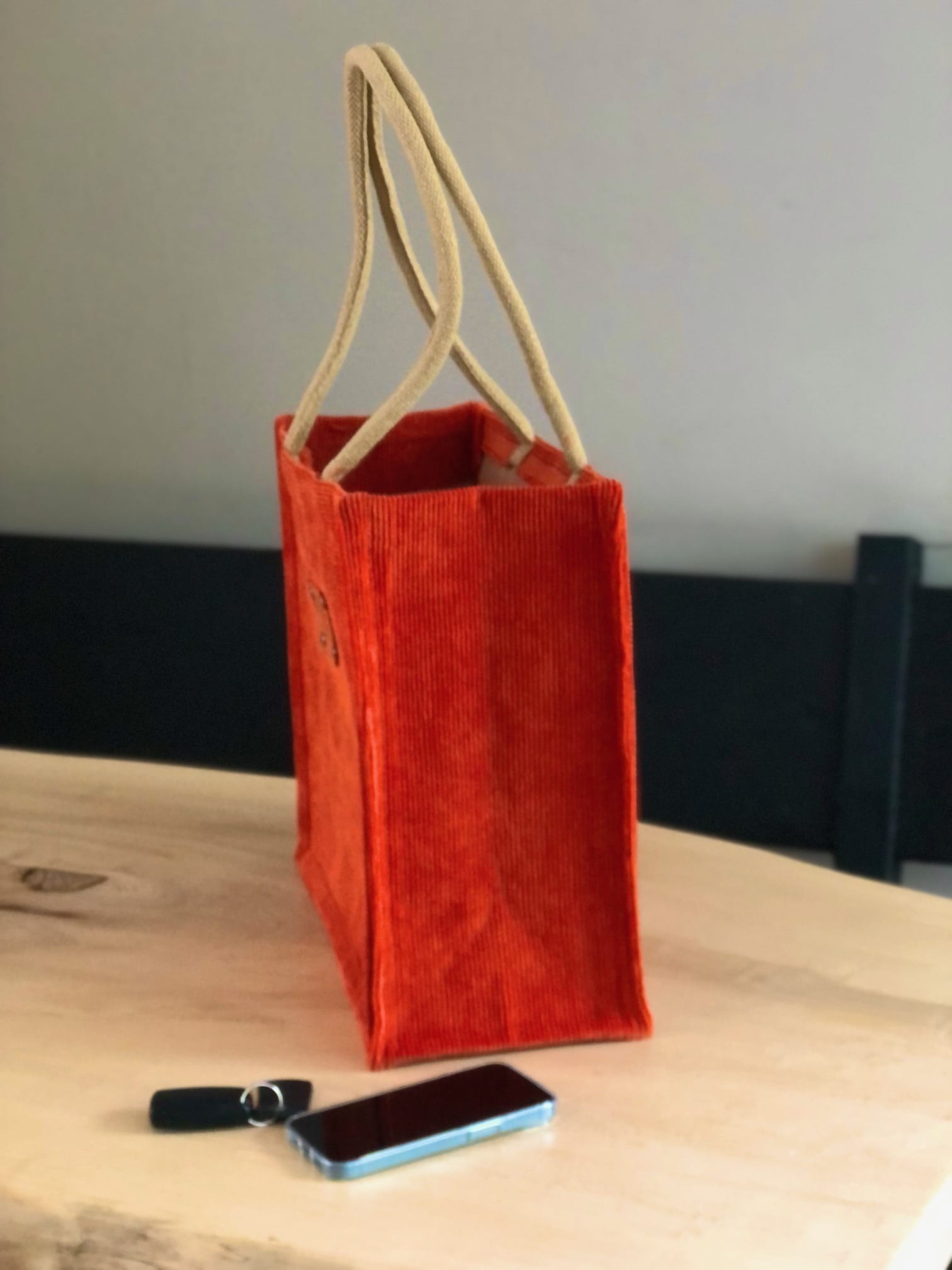 Duurzame jute shopper bekleed met oranje ribcord. Echt een hele mooie stoere tas. De tas is uitgevoerd met luxe katoenen gewatteerde hengsels van 70 cm voor optimaal draagcomfort. Aan de binnenkant zit een handig vakje met rits voor het opbergen van je portemonnaie of mobiel. Een mooie eenvoudige look, als je niet zo van toeters en bellen houdt.