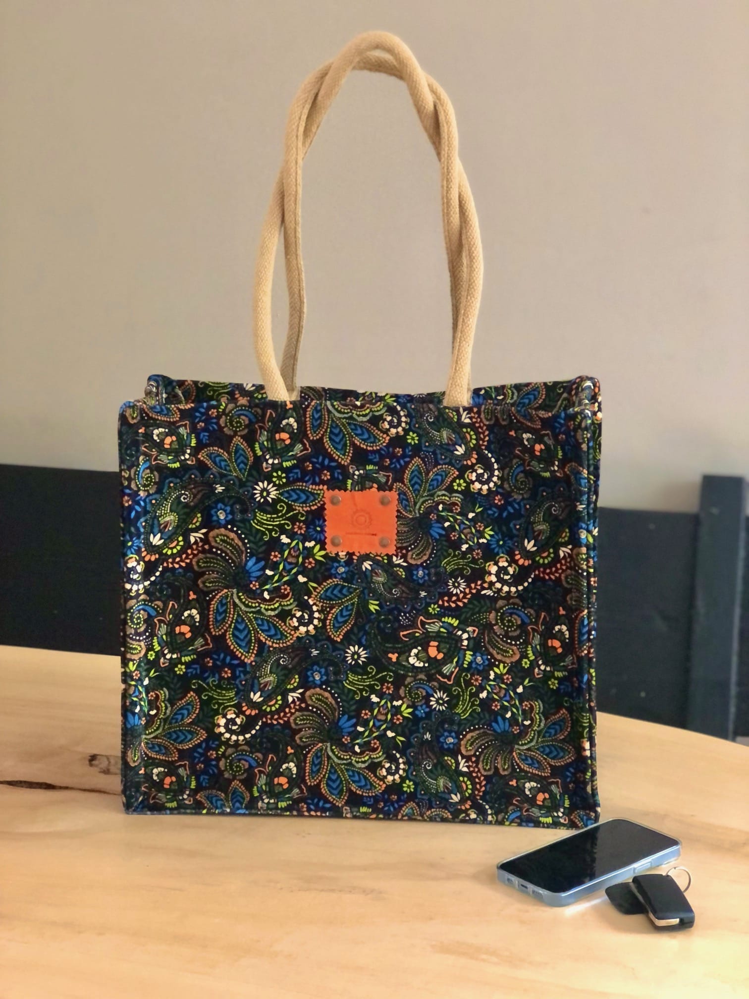 Duurzame jute shopper bekleed met velvet paisley. De stof is zacht fluweel in de heldere kleuren blauw, groen, oranje, en geel, de ondergrond is zwart. Uitgevoerd met luxe katoenen hengsels van 70 cm lang voor een optimaal draagcomfort. De tas heeft een handig binnenvakje met rits aan de binnenkant voor het opbergen van je sleutels of mobiel.