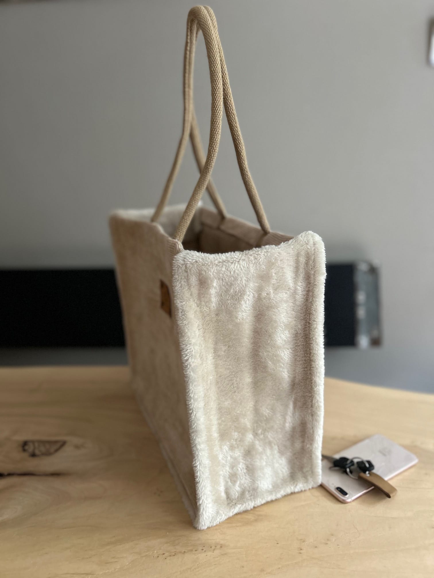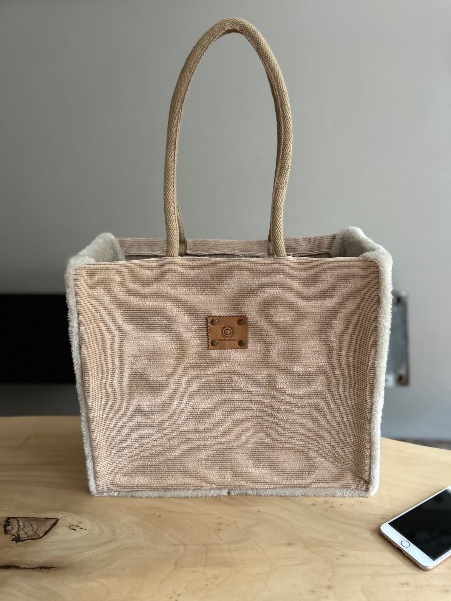 Duurzame jute shopper bekleed met beige ribcord en zachte fake bont. De voor en achterkant zijn van beige ribcord en de zijkanten van heerlijke zachte fake bont. Wil je dit andersom, kan dat ook. Vermeld dit even in de notities. De shopper is uitgevoerd met luxe katoenen gewatteerde hengsels voor optimaal draagcomfort. De tas heeft aan de binnenkant een handig vakje met een rits voor het opbergen van je portemonnee of mobiel.