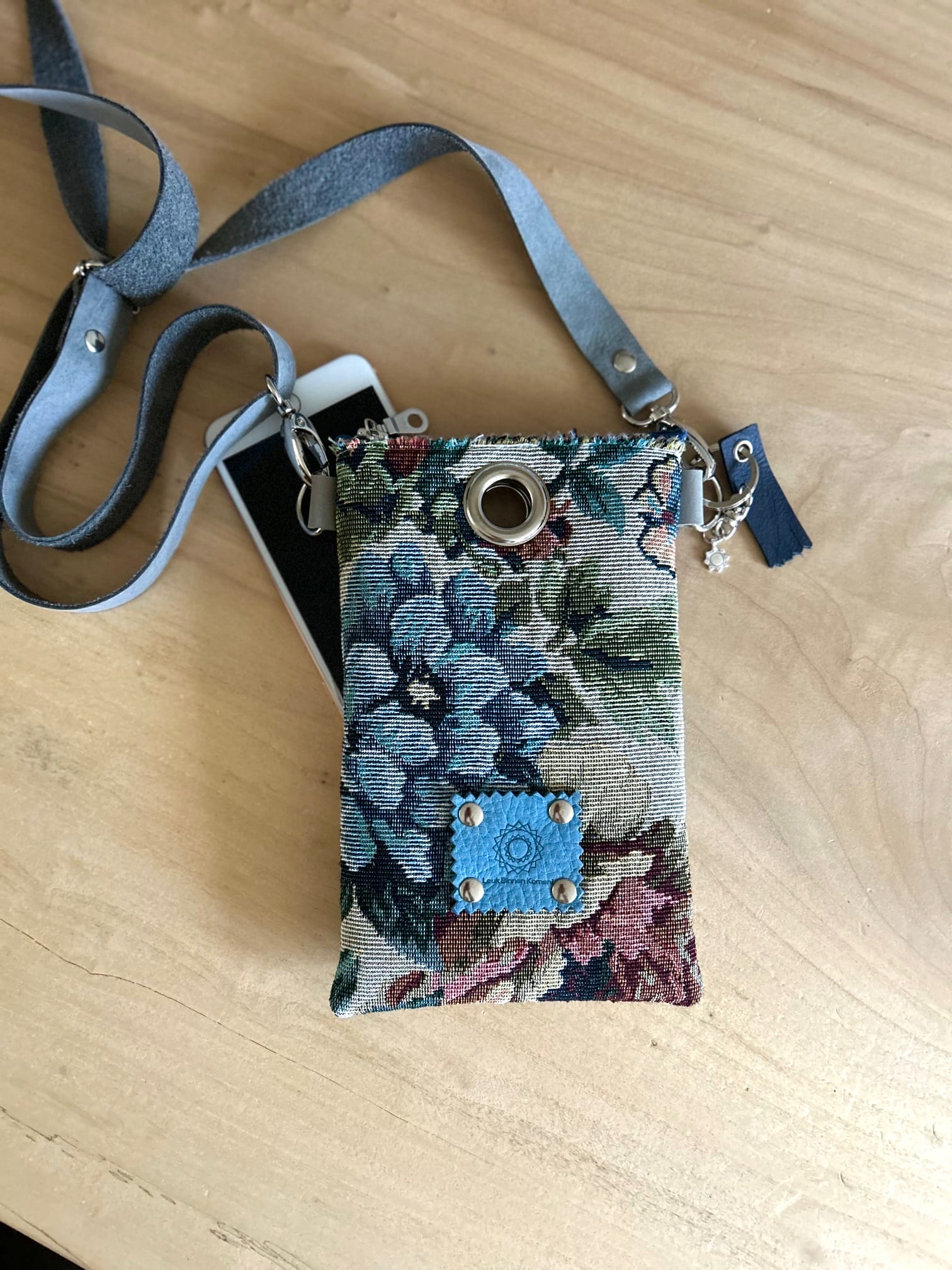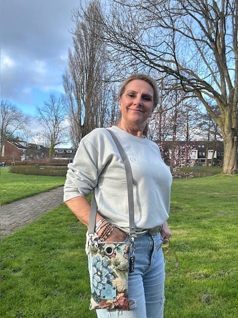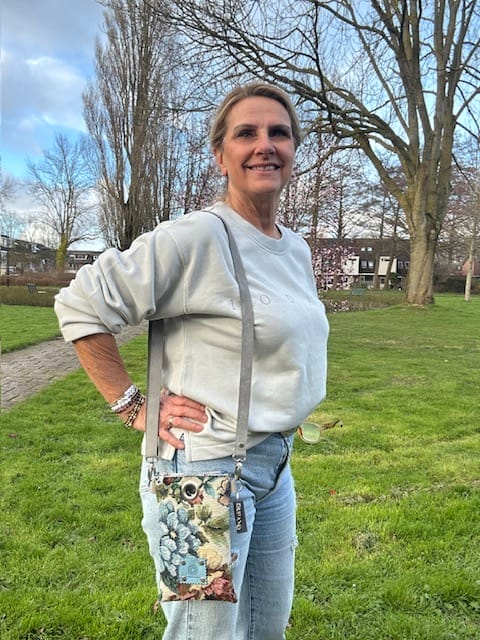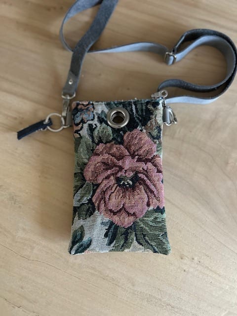 Festivaltasje van gobelin in vintage flower Sand. Een mooie chique stof met grote klassieke bloemen. Het tasje is aan de binnenkant verstevigd met vilt, en voorzien van een lang hengsel zodat je het schuin om je schouder kan dragen. Handig voor je telefoon als je een feestje hebt, of naar een festival . Het schoudertasje draagt lekker licht. Het tasje is groot genoeg voor het opbergen van je mobiel, lippenstift, en bril. Het hengsel is ongeveer 120 cm. Maar als je dat langer of korter wilt, kan dat! Bovenin zit een ritsje, en de sleutelhanger krijg je erbij.