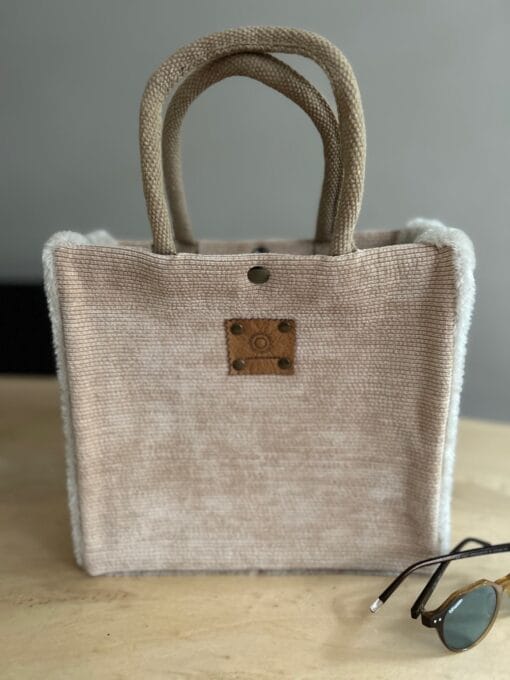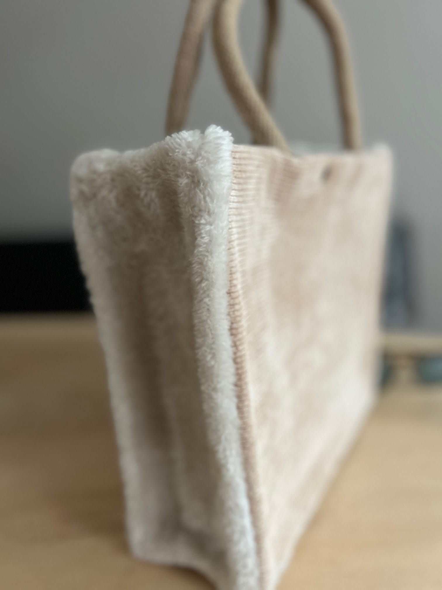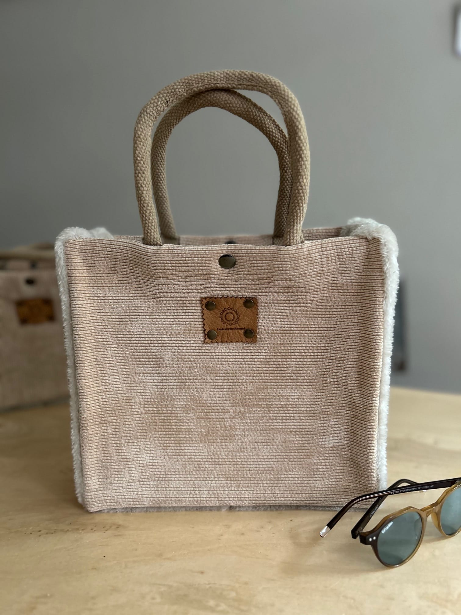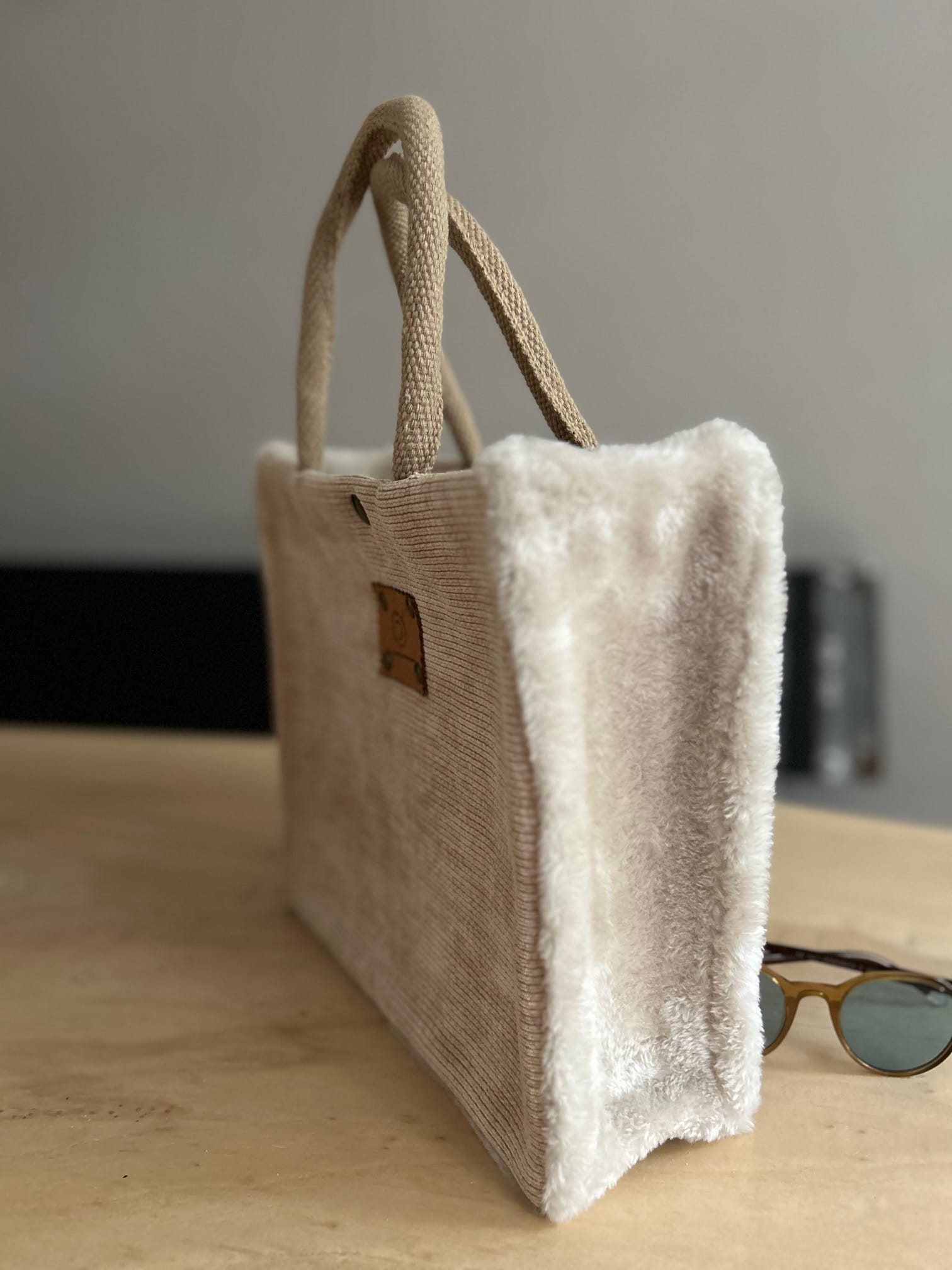 Handtas bekleed met zachte ribcord zachte fake bont. De voor en achterkant zijn van ribcord en de onder-en zijkanten van de zachte fake bont. Natuurlijk kan dit ook andersom als je dat wilt. Uitgevoerd met luxe gewatteerde hengsels van 40 cm voor optimaal draagcomfort. De hengsels snijden niet in je handen! Je thermosfles, of waterflesje past rechtop in het tasje. En daarbij kan nog makkelijk je lunch, portemonnee en eventueel een toilettasje. Bovenin af te sluiten met een drukker. Leuk als lunchtasje naar je werk, of gewoon als handtas.