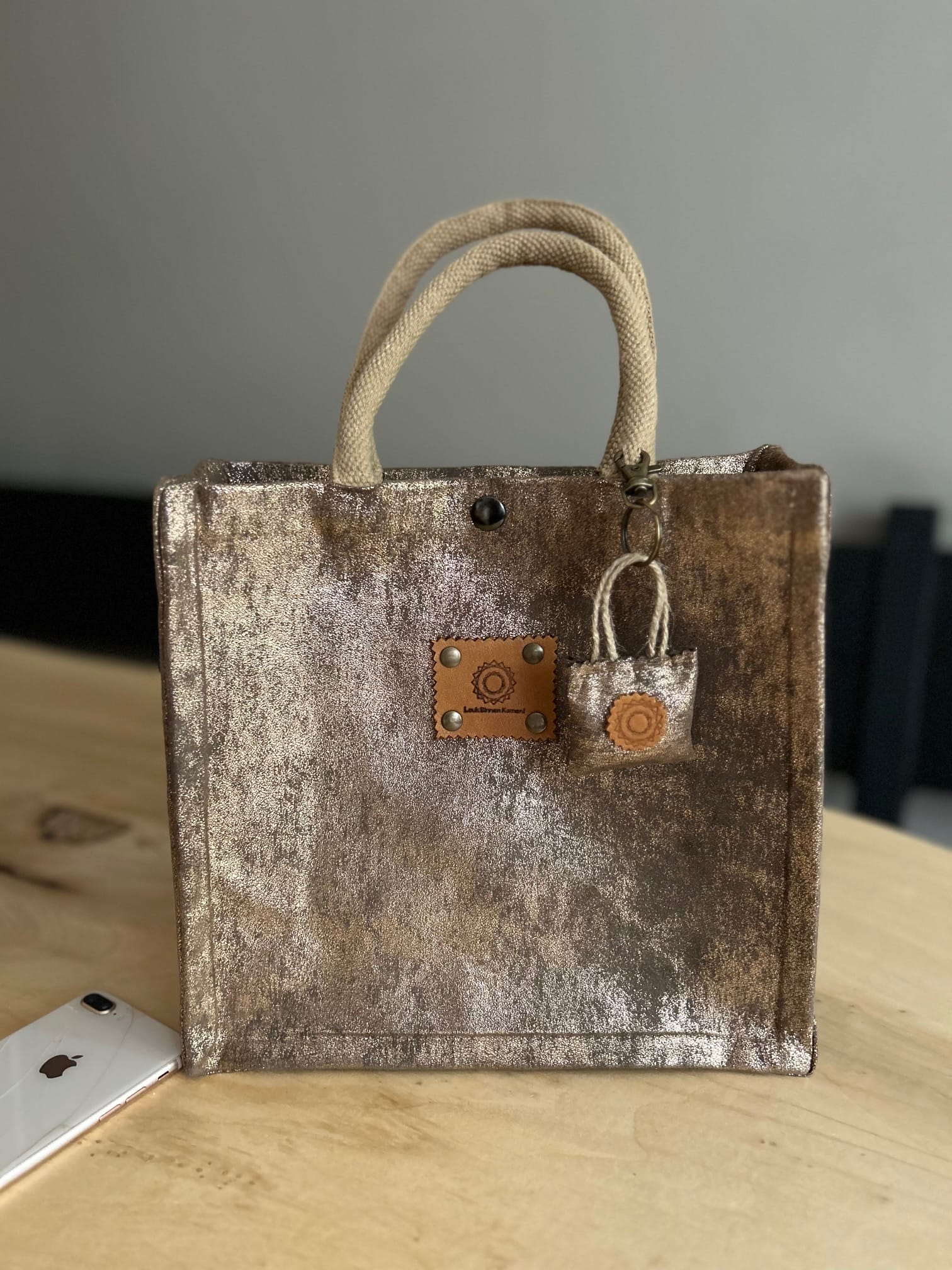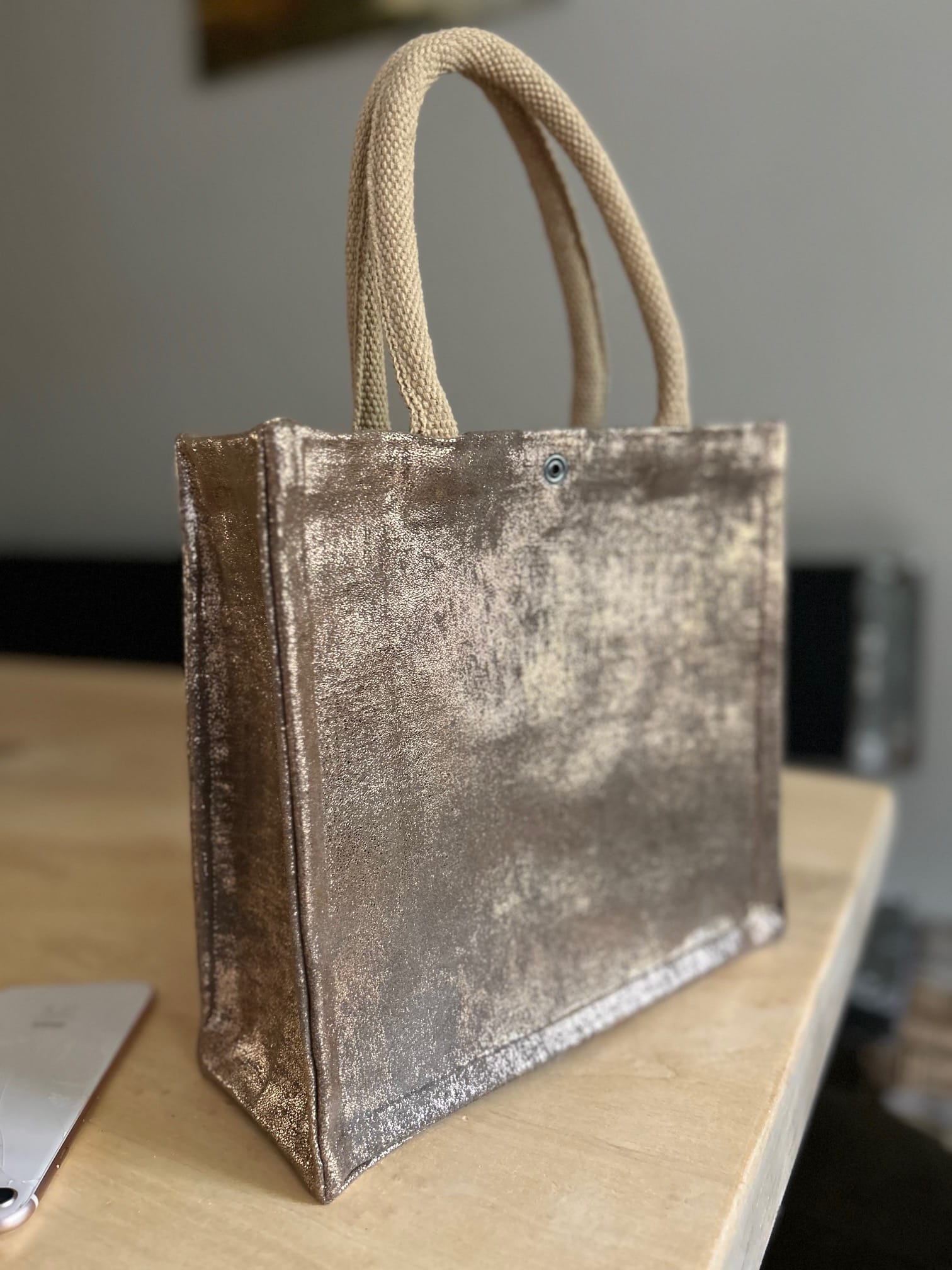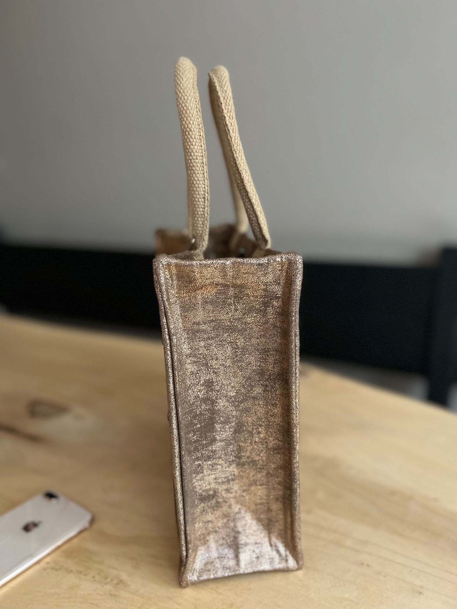 Handtas bekleed met fabby gold leatherlook. Een supermooie gouden leatherlook met chique uitstraling. Uitgevoerd met luxe gewatteerde hengsels van 40 cm voor optimaal draagcomfort. De hengsels snijden niet in je handen! Je thermosfles, of waterflesje past rechtop in het tasje. En daarbij kan nog makkelijk je lunch, portemonnee en eventueel een toilettasje. Bovenin af te sluiten met een drukker. Leuk als lunchtasje naar je werk, of gewoon als handtas.