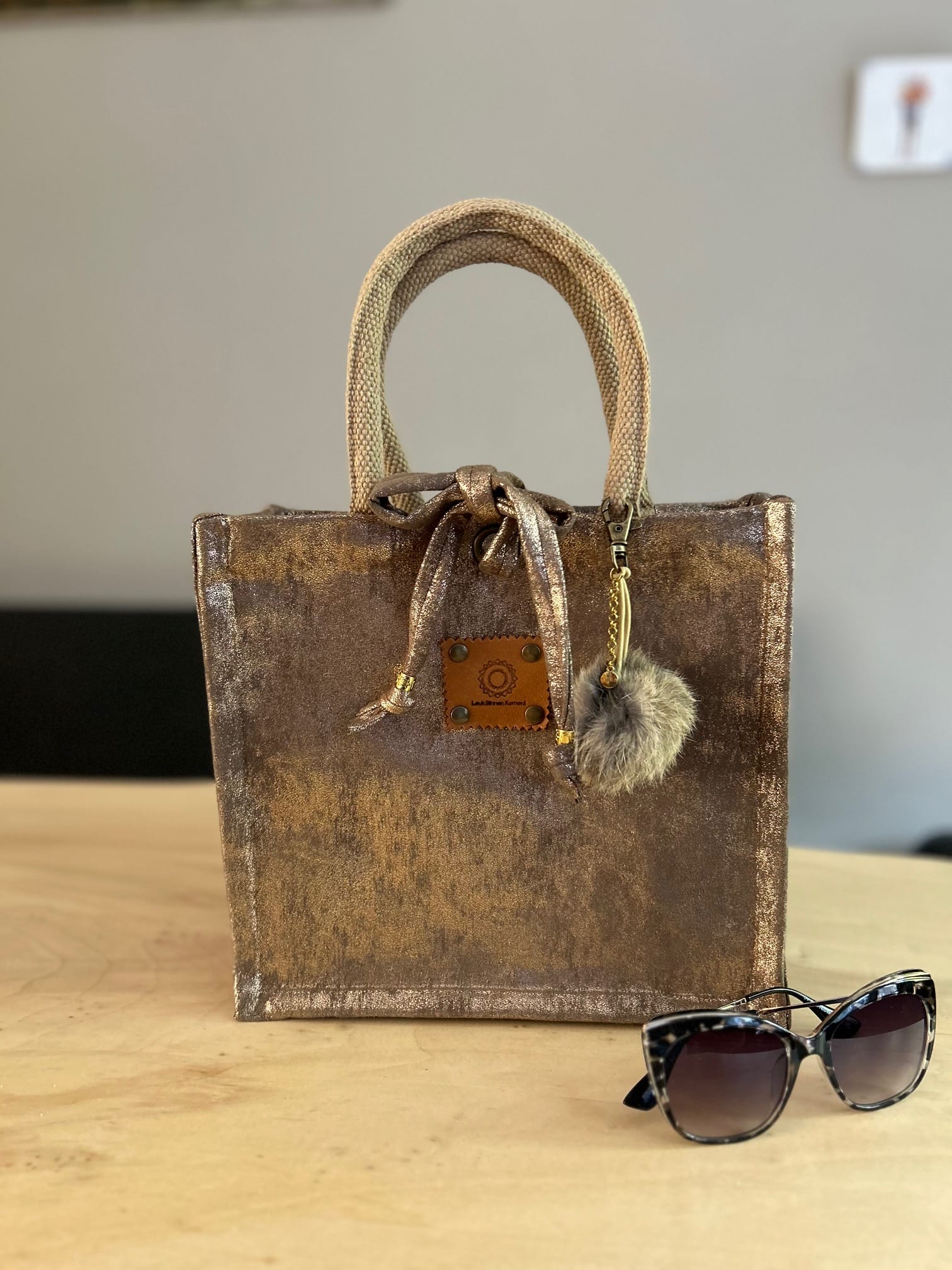 Handtas bekleed met fabby gold leatherlook leatherlook. Een supermooie gouden kleur! Uitgevoerd met luxe gewatteerde hengsels van 40 cm voor optimaal draagcomfort. De hengsels snijden niet in je handen! Je thermosfles, of waterflesje past rechtop in het tasje. En daarbij kan nog makkelijk je lunch, portemonnee en eventueel een toilettasje. Bovenin af te sluiten met een koord. Leuk als lunchtasje naar je werk, of gewoon als handtas.