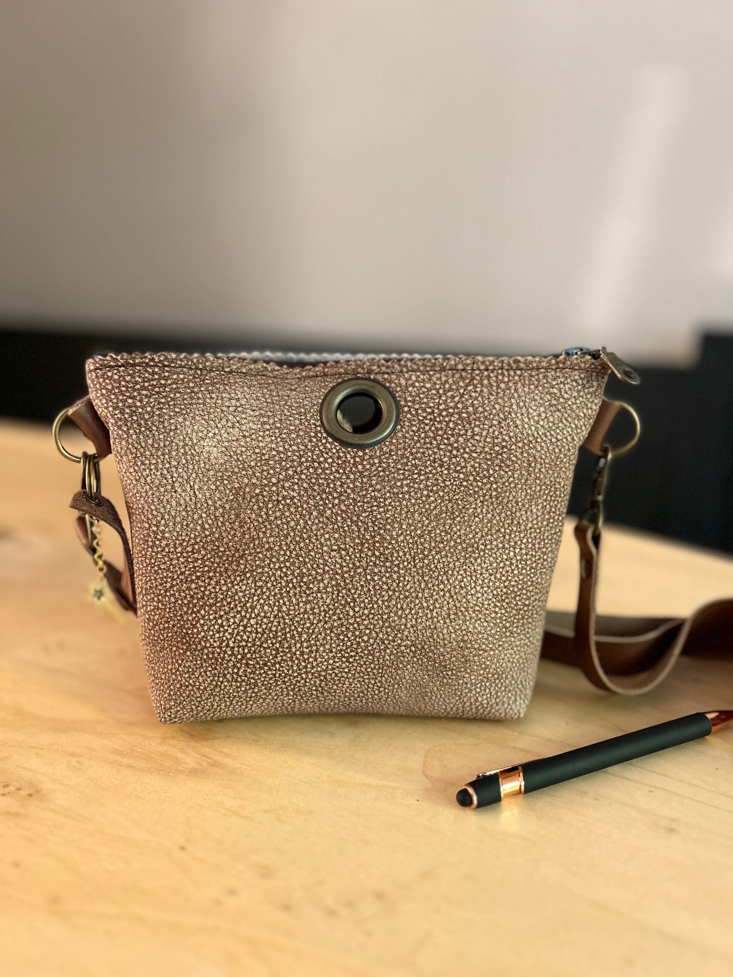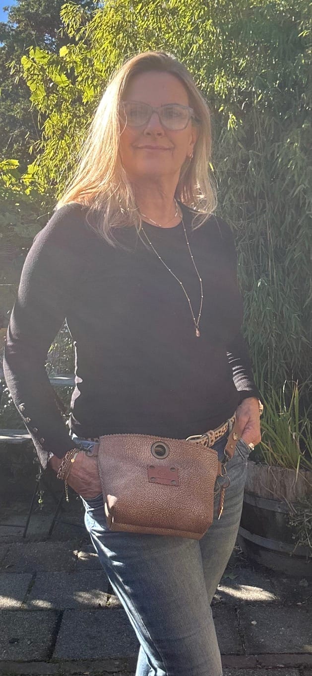 Heuptas van bruine cantara leather met verstelbare leren riem. De stoere leatherlook lijkt een beetje op geschuurd leer. De tas kan ook besteld worden als schoudertas, geef dan aan hoe lang je de riem wilt. Het tasje is aan de binnenkant verstevigd met vilt. Je kan de riem verlengen zodat je het tasje kan dragen als fannypack, of schoudertas. Aan de bovenkant zit een ritsje. Er is ruimte voor je telefoon, klein portemonneetje, lippenstift, en eventueel een bril. De sleutelhanger krijg je erbij! Kan ook met lang hengsel, zodat je het tasje als schoudertas kan dragen.