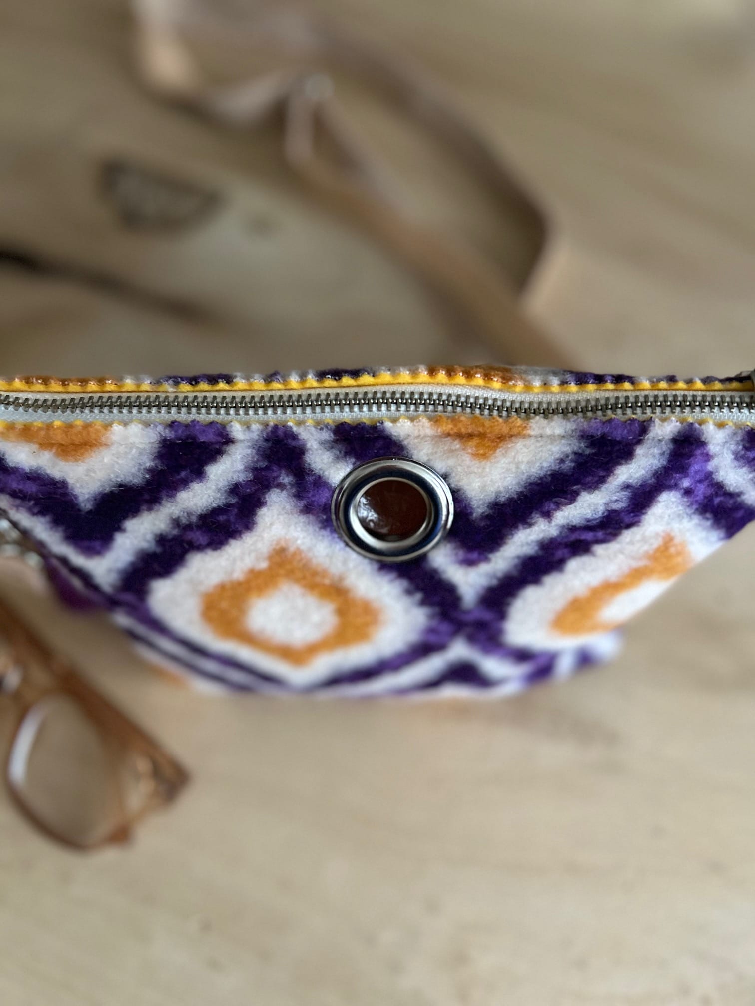 Heuptas van coocked wool in retro wooly purple, en verstelbare leren riem, en rits aan de bovenkant. De binnenkant is verstevigd met vilt. De tas kan ook besteld worden als schoudertas, geef dat even aan als je dat liever wilt. Het tasje is aan de binnenkant verstevigd met vilt. Je kan de riem verlengen zodat je het tasje kan dragen als fannypack, of schoudertas.   Er is ruimte voor je telefoon, klein portemonneetje, lippenstift, en eventueel een bril. De sleutelhanger krijg je erbij! Kan ook met lang hengsel, zodat je het tasje als schoudertas kan dragen.
