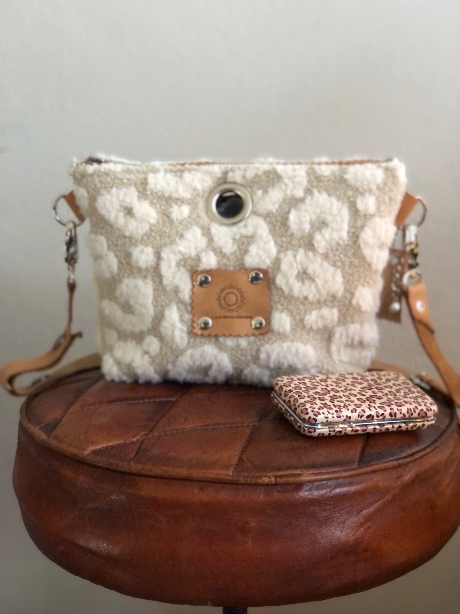 Heuptas van lichtbeige teddy en fluffy pantervlekken