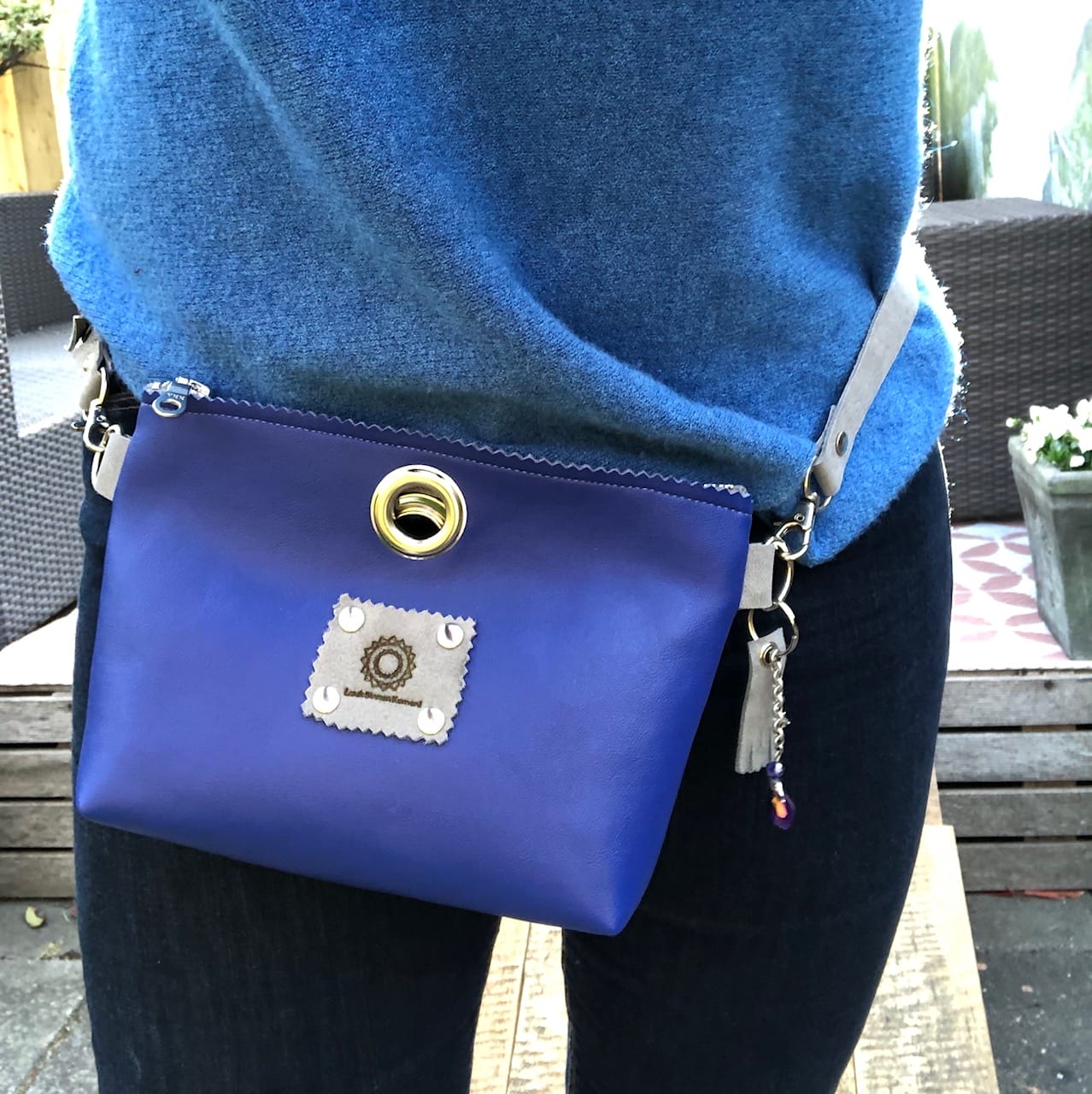 Heuptas van ultramarijn blauwe leatherlook met verstelbare leren riem. Je kan de riem verlengen zodat je het tasje kan dragen als fannypack, of schoudertas. Aan de bovenkant zit een ritsje. Er is ruimte voor je telefoon, klein portemonneetje, lippenstift, en eventueel een bril. Super handig voor een feestje of festival. De onderkant hebben we wat breder gemaakt ± 3 á 4 cm, lekker overzichtelijk dus. De sleutelhanger krijg je erbij!