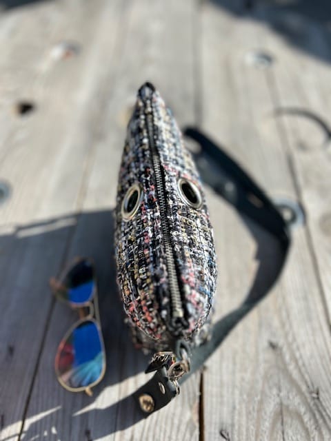Heuptasje van chique zwarte Sjanella. De stof heeft diverse vrolijke kleuren, en door de hele stof loopt een zilver, en gouddraad. Aan de bovenkant zit een rits, er is ruimte voor je telefoon, klein portemonneetje, lippenstift, een (zonne)bril, zelfs een klein flesje water. De onderkant hebben we wat breder gemaakt ± 5 á 6 cm, lekker overzichtelijk dus. De sleutelhanger krijg je erbij! De riem is verstelbaar in 3 lengtes, Je kan het tasje ook als fannypack dragen of als schoudertas. Wil je een gewone lange riem, kan dat ook.