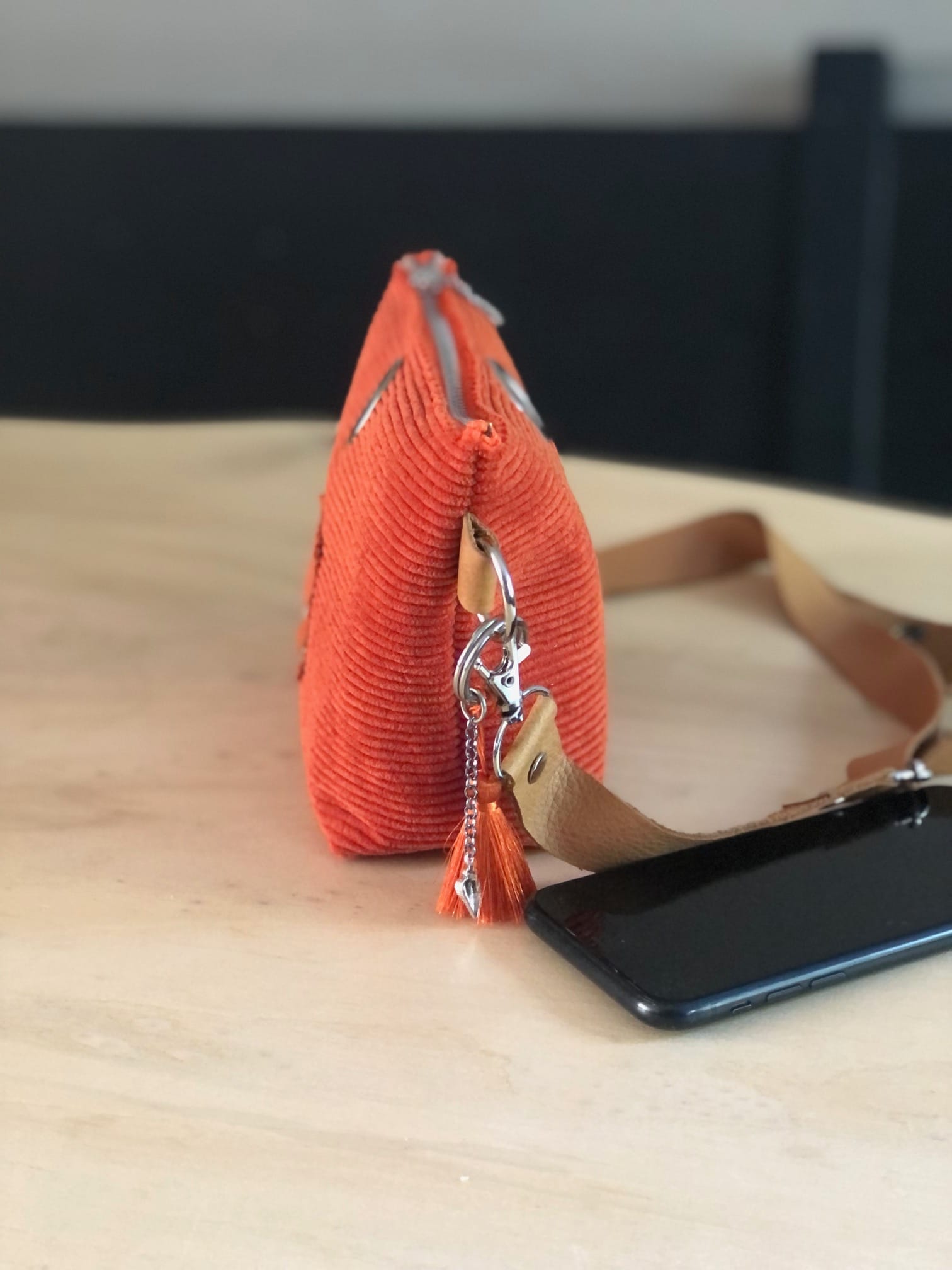 Heuptasje van oranje ribcord met verstelbare leren riem. De riem is verstelbaar in 3 maten, zodat je het tasje ook als fannypack of schoudertas kan dragen, maar geef bij je bestelling even je taillemaat door! Het tasje is af te sluiten met een rits, en aan de binnenkant bekleed met bijpassende kleur vilt, maar als je een andere kleur wilt, kan dat ook, vraag naar de mogelijkheden. Er is genoeg ruimte voor portemonneetje, telefoon, bril, lippenstift.. Superhandig voor een feestje, of festival, of tijdens een wandeltocht. De onderkant hebben we wat breder gemaakt, lekker overzichtelijk dus. Sleutelhanger is inbegrepen!