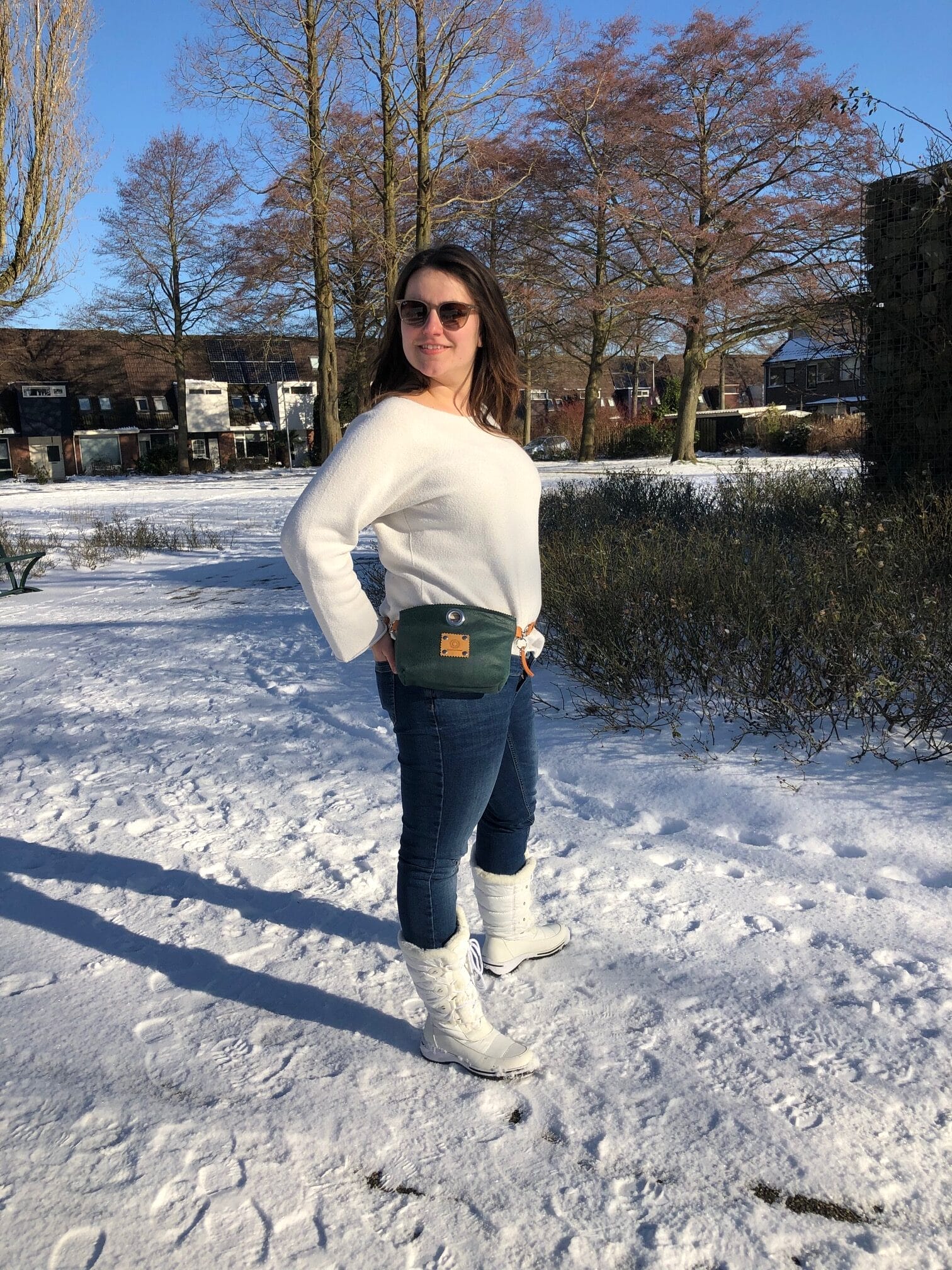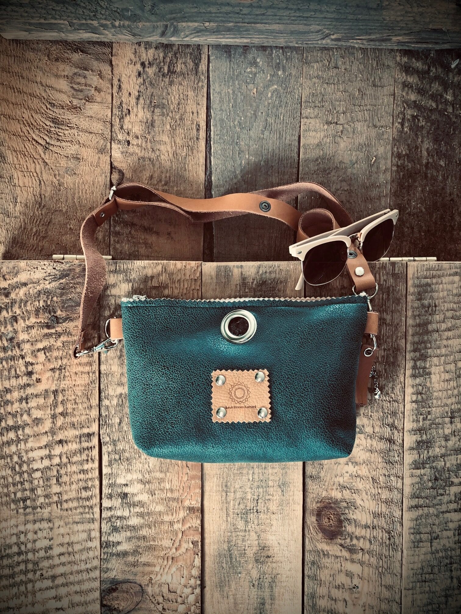 Heuptasje van petrolgroene leatherlook met verstelbare leren riem. Je kan de riem verlengen zodat je het tasje kan dragen als fannypack. Aan de bovenkant zit een ritsje.  Er is ruimte voor je telefoon, klein portemonneetje, lippenstift, en eventueel een bril. Super handig voor een feestje of festival. De onderkant hebben we wat breder gemaakt ± 3 á 4 cm, lekker overzichtelijk dus. De sleutelhanger krijg je erbij! Kan ook besteld worden als cross-over met een riem van ongeveer 120 cm. Geef aan welke je wilt!