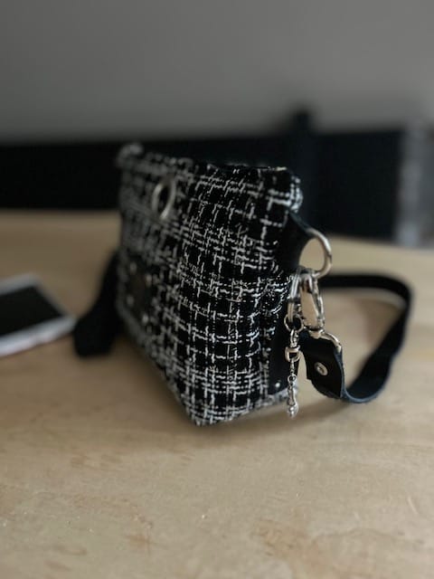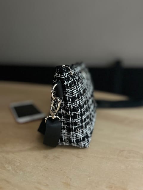 Heuptasje van Sjanel black met zilverdraad. Een prachtige zwarte geweven stof met wit, en die door de vele zilverdraden een heel chique uitstraling krijgt. Aan de bovenkant zit een rits, er is ruimte voor je telefoon, klein portemonneetje, lippenstift, een (zonne)bril. De onderkant hebben we wat breder gemaakt ± 5 á 6 cm. De riem is verstelbaar, waardoor je het tasje ook als schoudertasje of fannypack kan dragen. De sleutelhanger krijg je erbij. Geef je heupmaat door als je het als heuptas wil dragen.