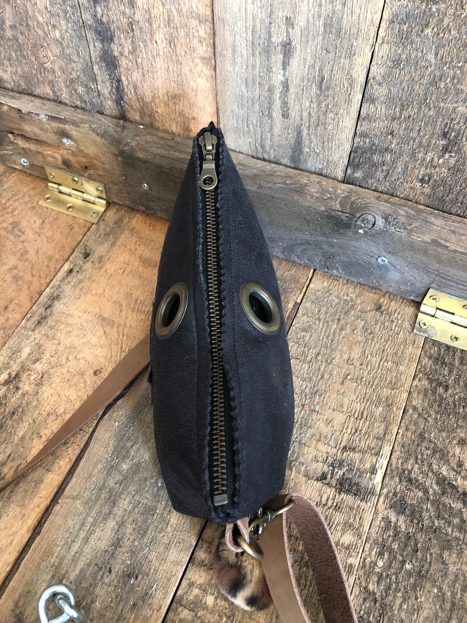 Heuptasje van zwarte leatherlook met verstelbare leren riem. Je kan de riem verlengen zodat je het tasje kan dragen als fannypack. Aan de bovenkant zit een ritsje. Er is ruimte voor je telefoon, klein portemonneetje, lippenstift, en eventueel een bril. Super handig voor een feestje of festival. De onderkant hebben we wat breder gemaakt ± 3 á 4 cm, lekker overzichtelijk dus. De sleutelhanger krijg je erbij! Kan ook besteld worden als cross-over met een riem van ongeveer 120 cm. Geef aan welke je wilt!