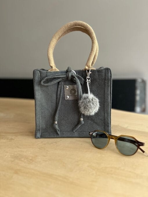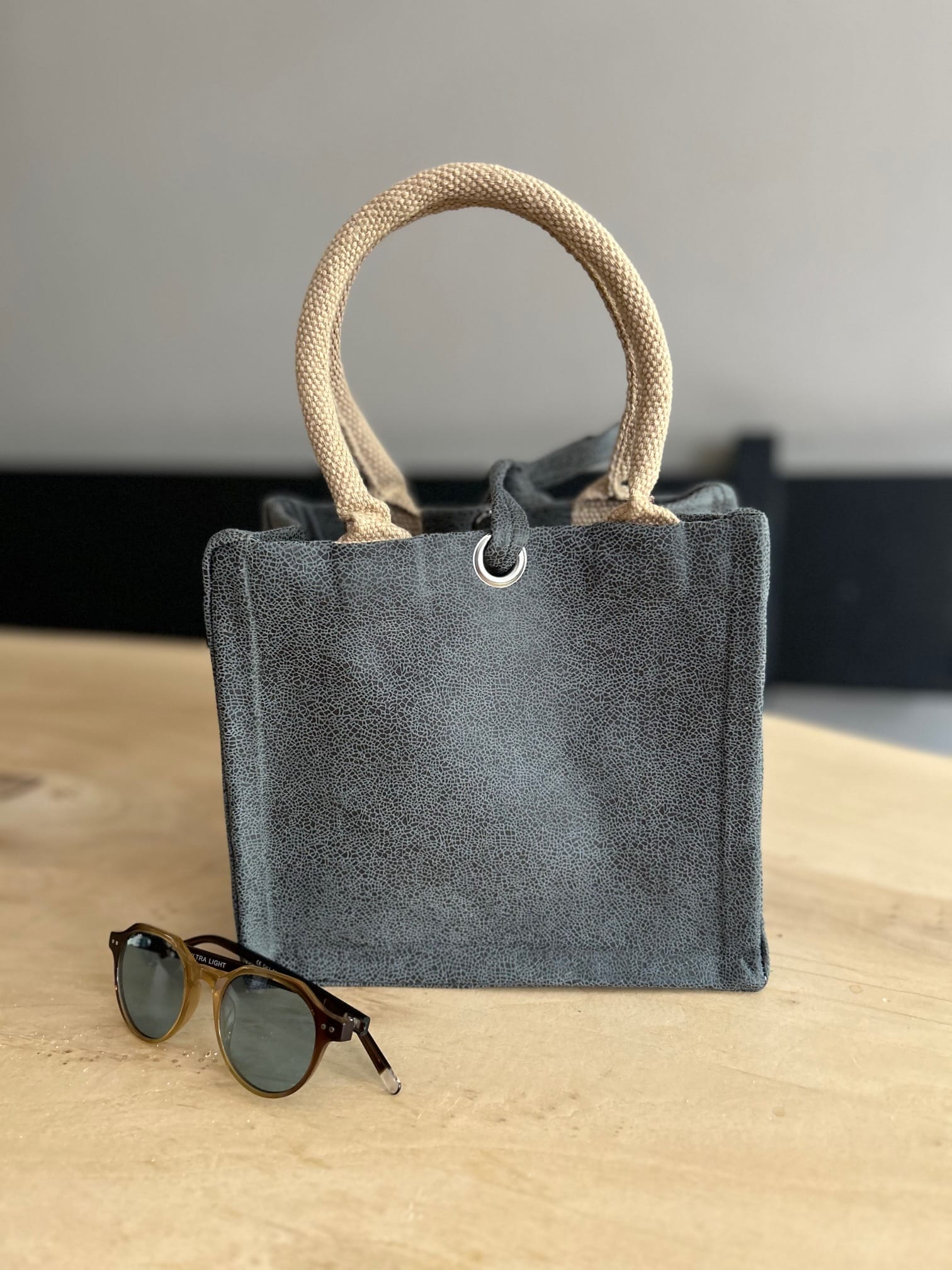 Kleine jute tas bekleed met donkergrijze leatherlook. Uitgevoerd met luxe gewatteerde hengsels van 40 cm voor optimaal draagcomfort. De hengsels snijden niet in je handen! Leuk als lunchtas naar school, of naar je werk, maar ook als handtas heel handig!