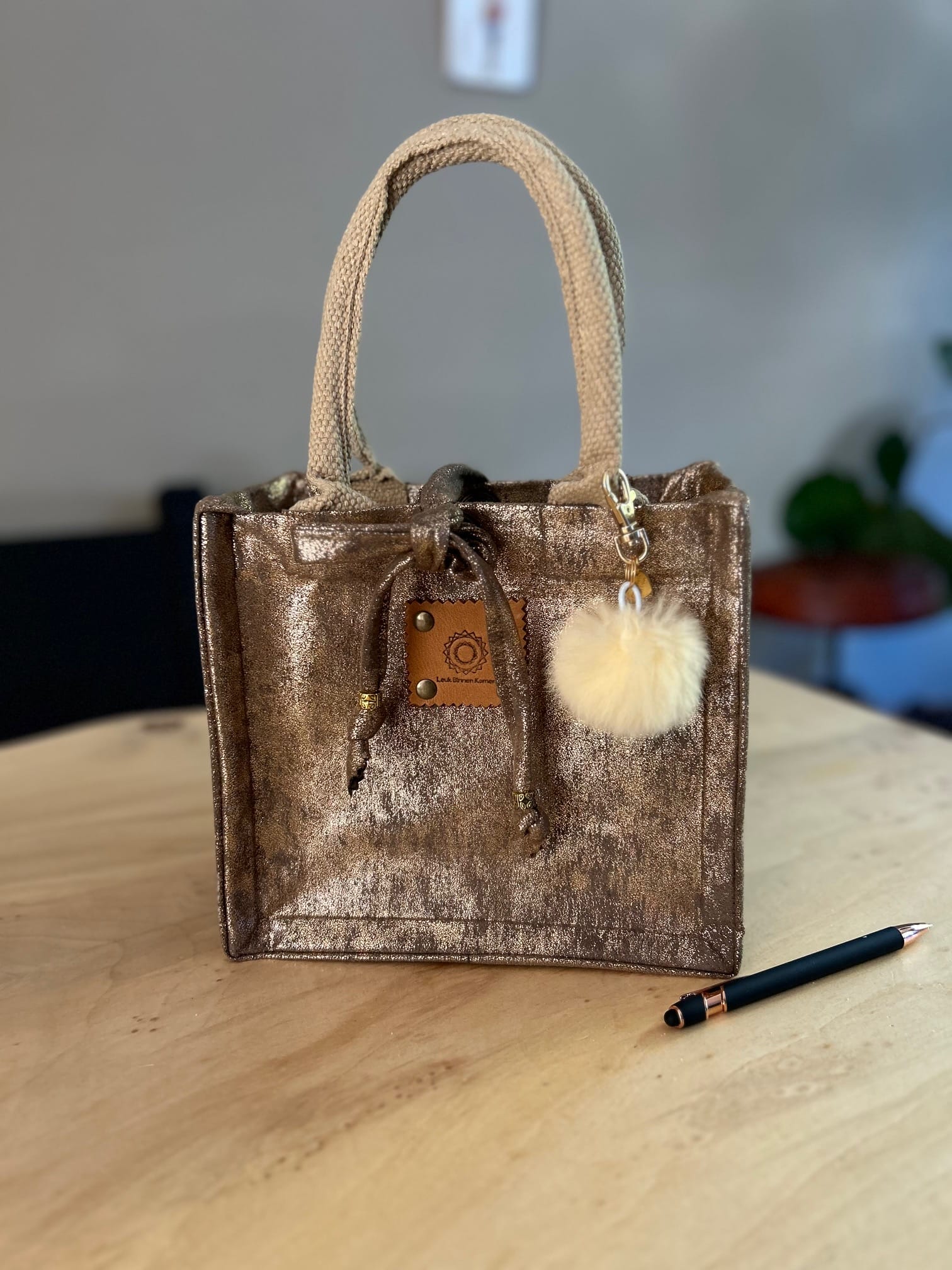 Kleine jute tas bekleed met fabby gold leatherlook. Een supermooie gouden kleur die de tas een chique uitstraling geeft. Deze kleine tas is uitgevoerd met luxe gewatteerde hengsels van 40 cm voor optimaal draagcomfort. De hengsels snijden niet in je handen! Leuk als lunchtas naar school, of naar je werk, maar ook als handtas heel handig!