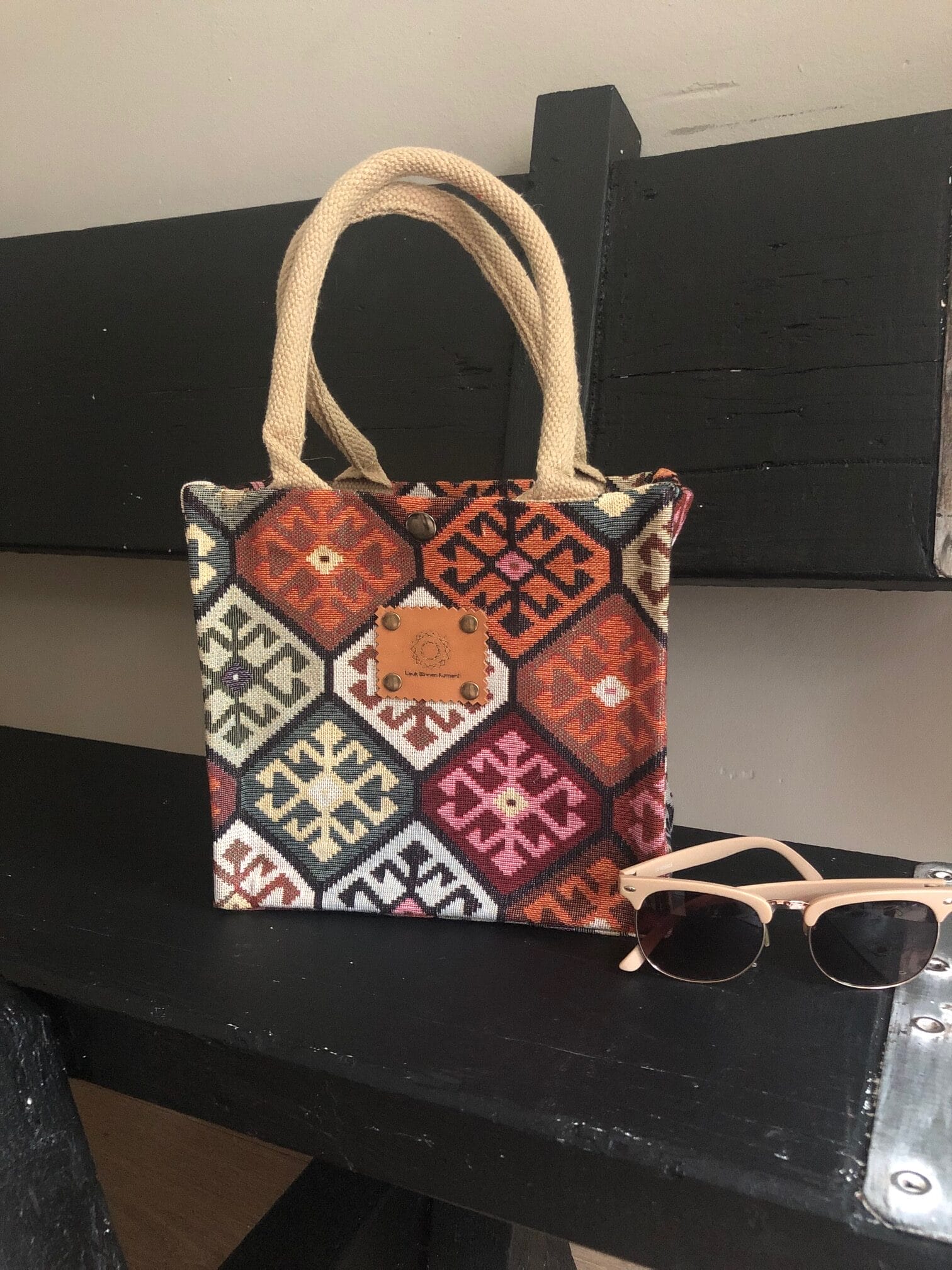 Kleine jute tas bekleed met gobelin in retro to the max. Een superleuk tasje in een hippe retro-look! Uitgevoerd met luxe gewatteerde hengsels van 40 cm voor optimaal draagcomfort. De hengsels snijden niet in je handen! Ook leuk als lunchtasje naar school, of naar je werk, of gewoon als handtas. Af te sluiten met een drukker aan de bovenkant.