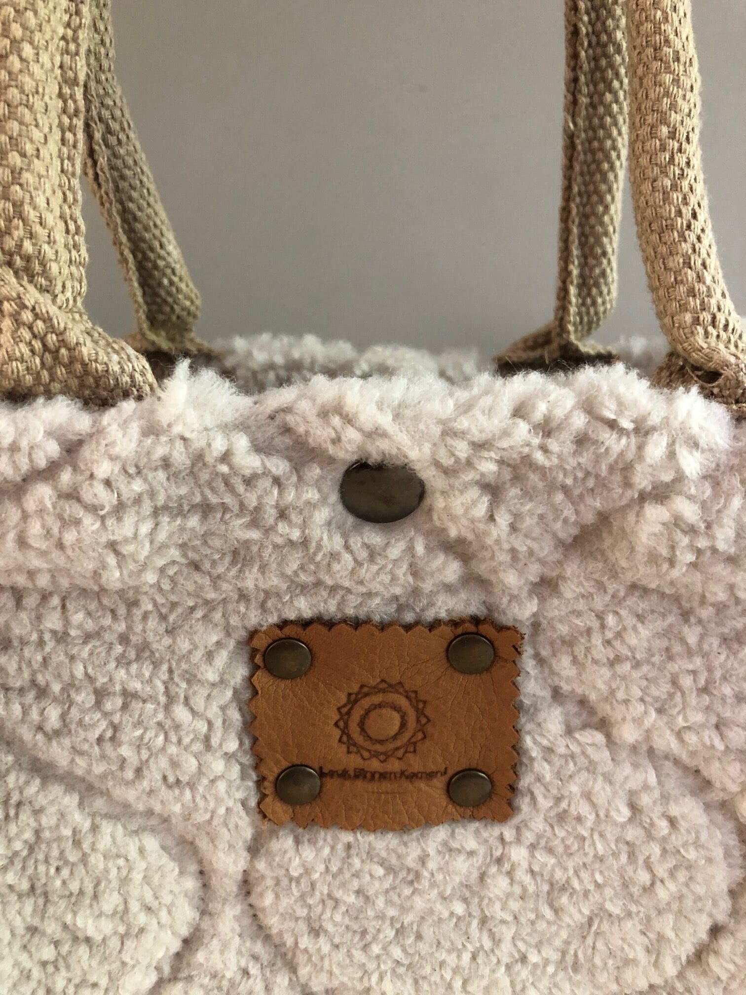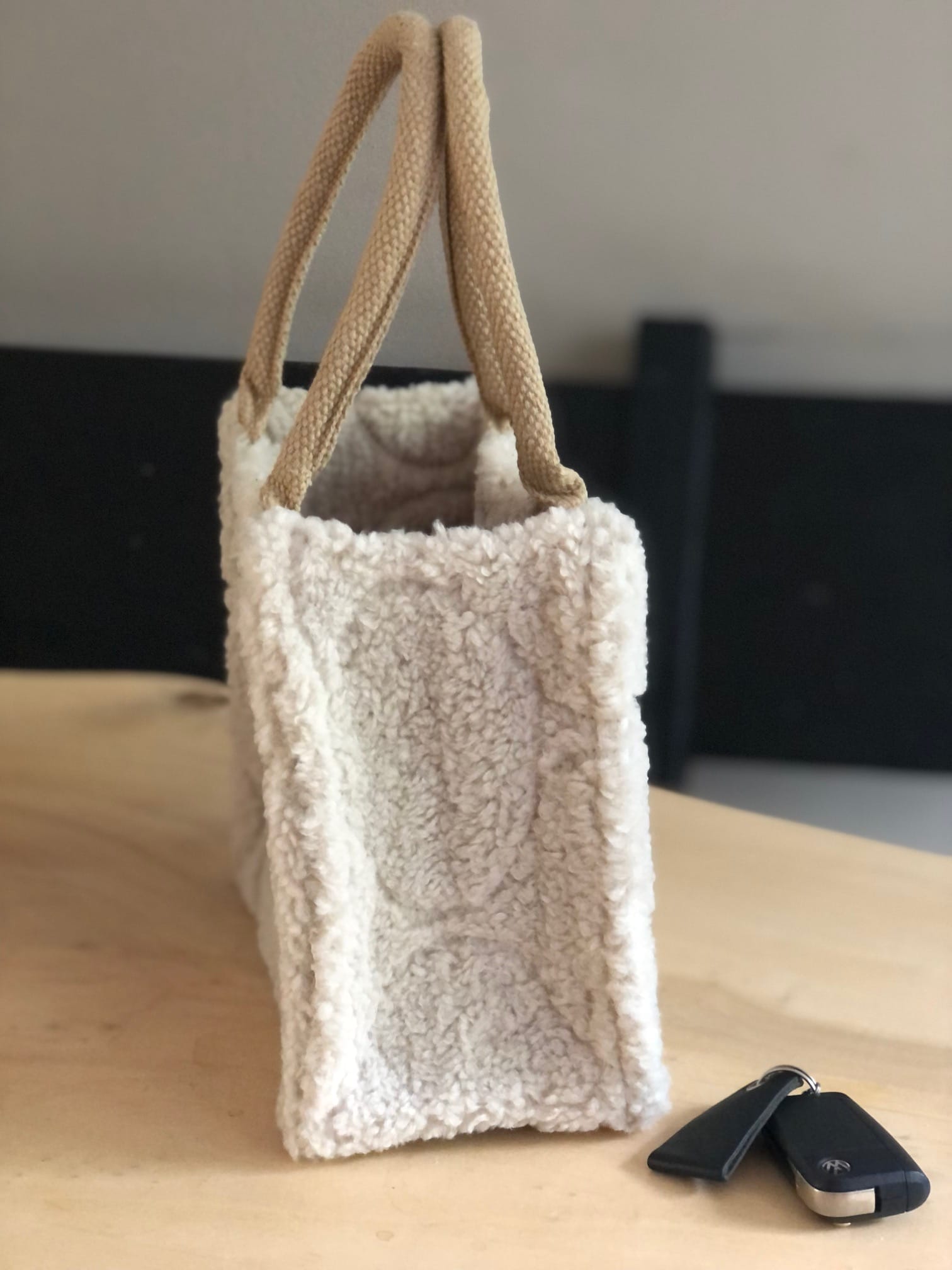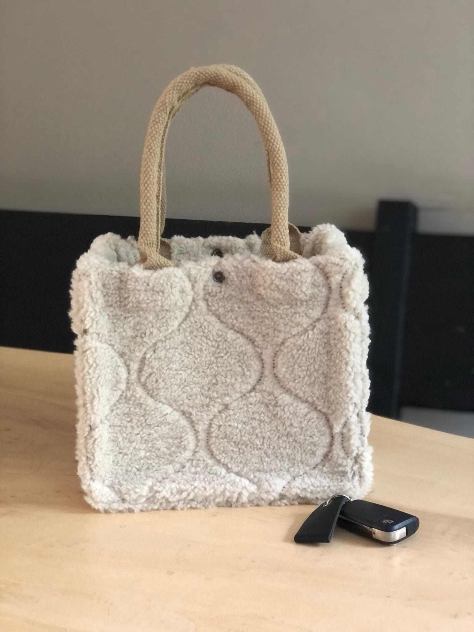 Kleine jute tas bekleed met zachte Off-White teddy sharpa jacquard . Een heerlijk zachte teddy met leuk motief. Uitgevoerd met luxe gewatteerde hengsels van 40 cm voor optimaal draagcomfort. De hengsels snijden niet in je handen! Leuk als lunchtasje naar school, of naar je werk, of gewoon als handtas. Af te sluiten met een drukker aan de bovenkant.