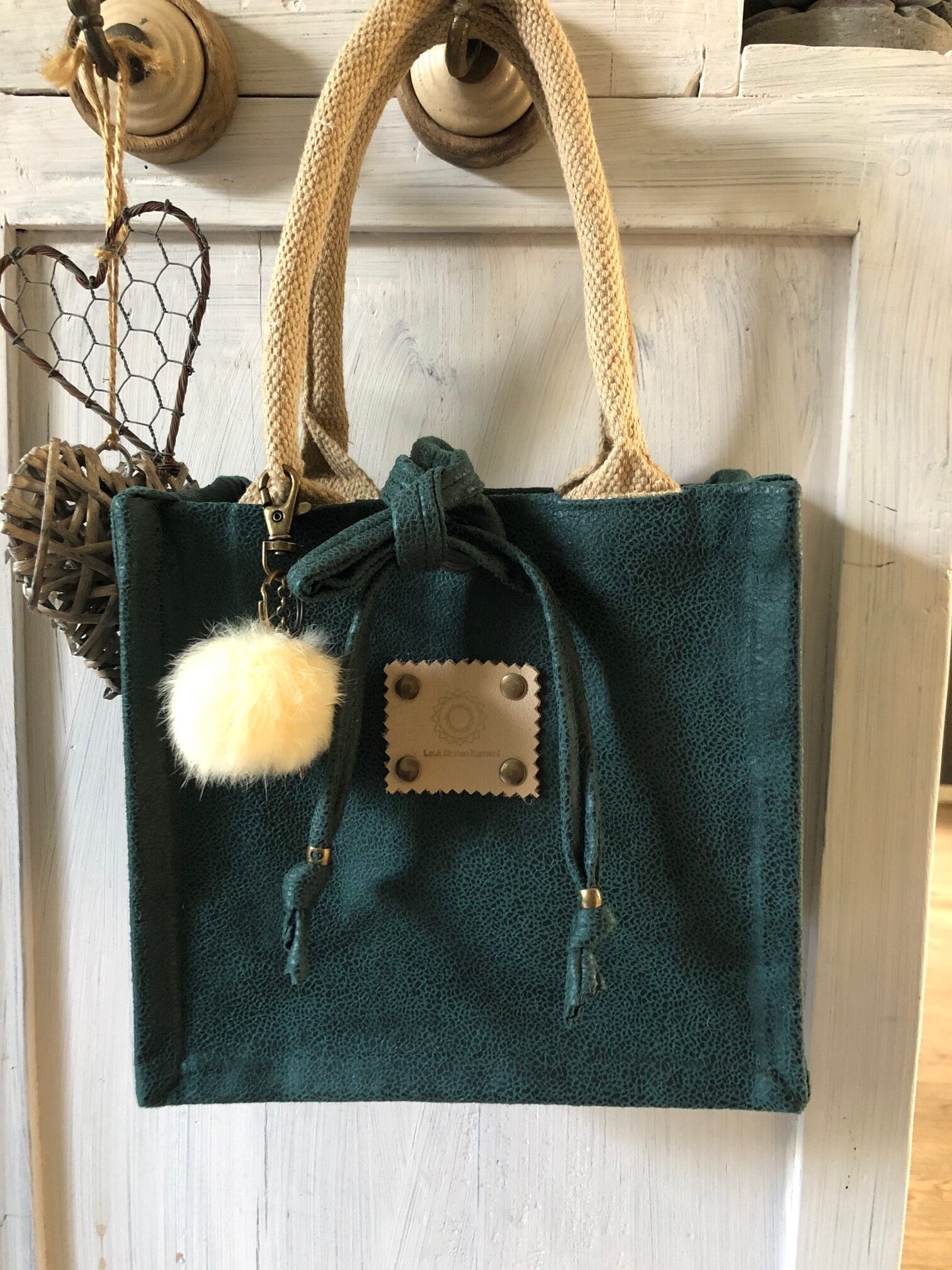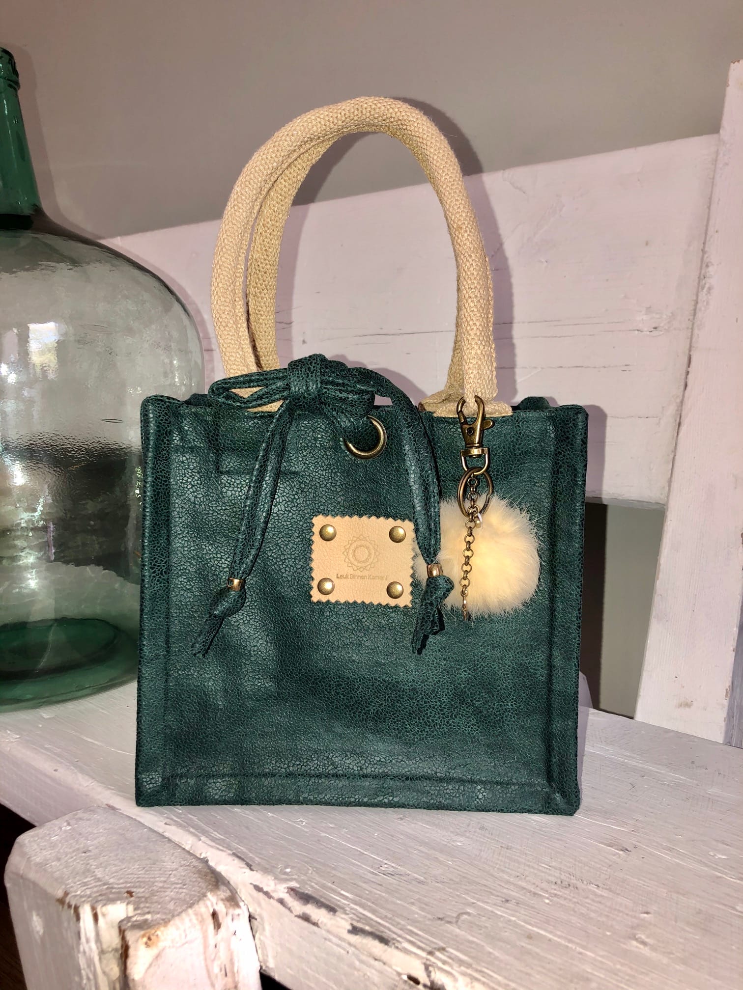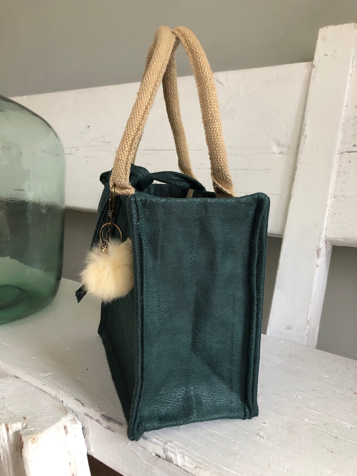 Kleine jute tas bekleed met petrolgroene leatherlook. Deze kleine stoere tas is uitgevoerd met luxe gewatteerde hengsels van 40 cm voor optimaal draagcomfort. De hengsels snijden niet in je handen! Leuk als lunchtas naar school, of naar je werk, maar ook als handtas heel handig!