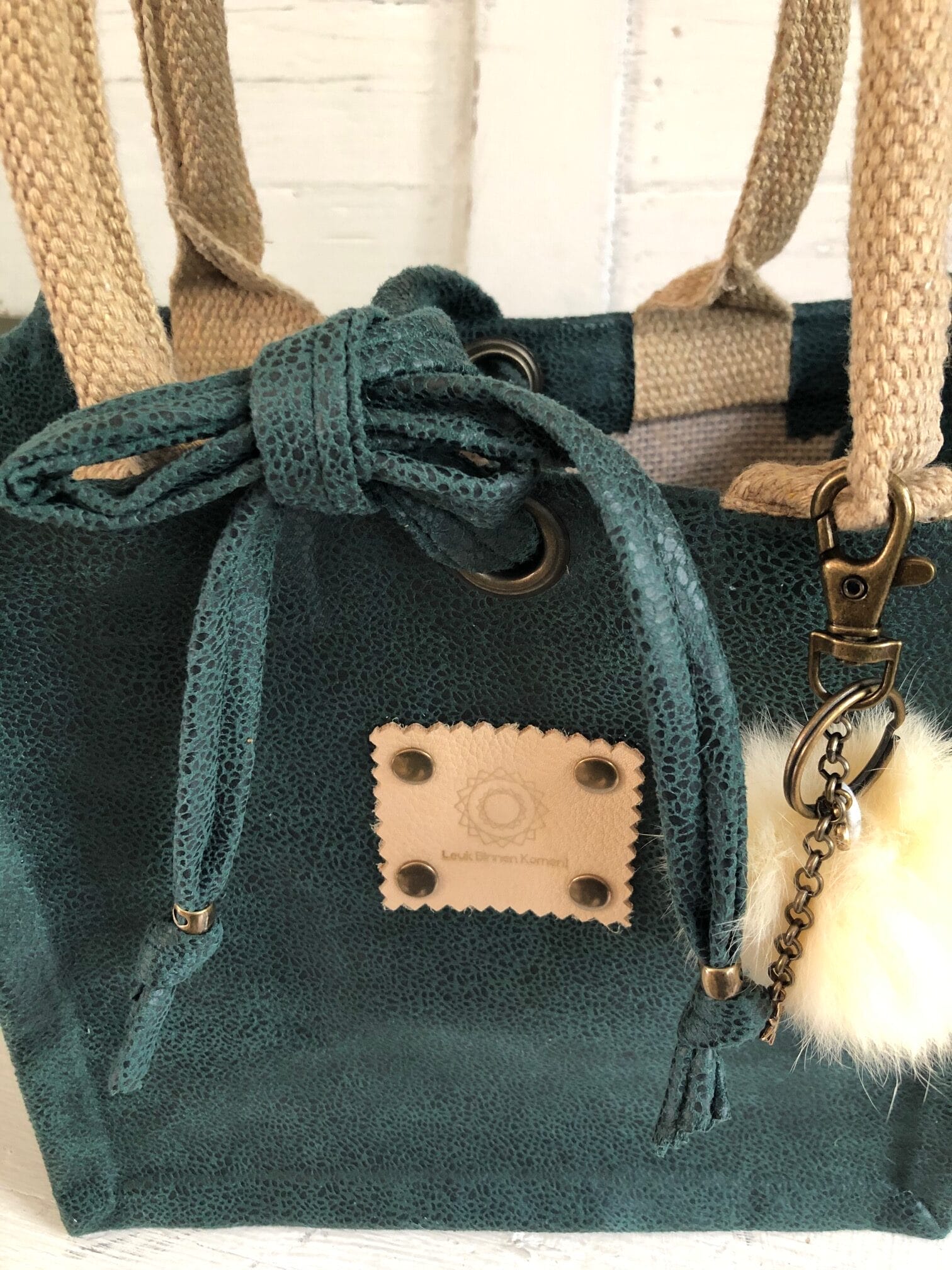 Kleine jute tas bekleed met petrolgroene leatherlook