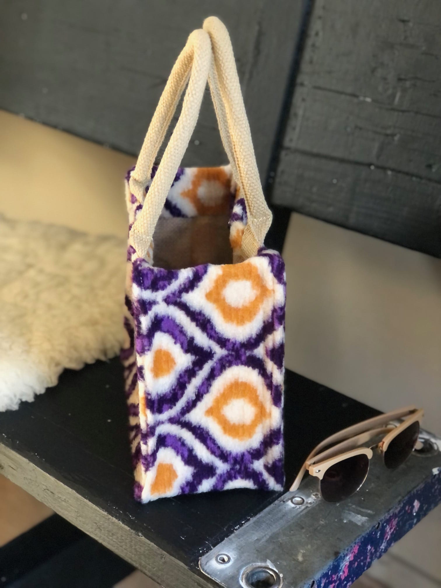 Kleine jute tas bekleed met Retro wooly purple. Een super toffe coocked wool met een leuke retrolook in, paars, oranje en ecru. Uitgevoerd met luxe gewatteerde hengsels van 40 cm voor optimaal draagcomfort. De hengsels snijden niet in je handen! Leuk als lunchtasje naar school, of naar je werk, of gewoon als handtas. Af te sluiten met een drukker aan de bovenkant.