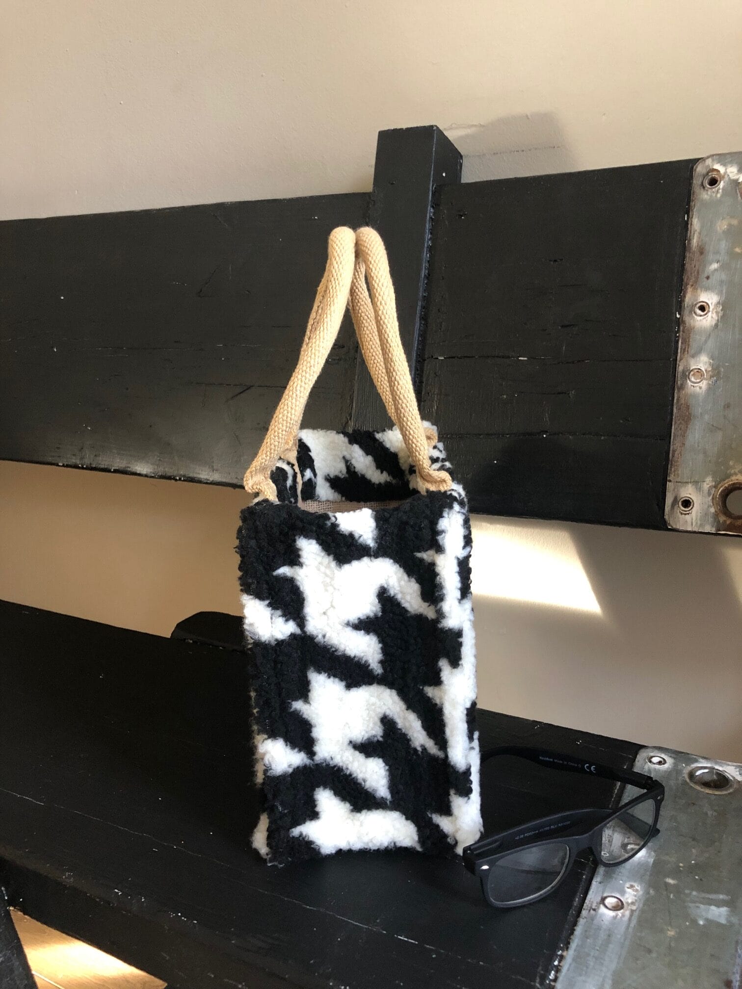 Kleine jute tas bekleed met teddy in Pied de Poule ruit. Een hele leuke chique tas in zwart wit teddy met het welbekende pied de poule patroon. Uitgevoerd met luxe gewatteerde hengsels van 40 cm voor optimaal draagcomfort. De hengsels snijden niet in je handen! Leuk als lunchtasje naar school, of naar je werk, of gewoon als handtas. Af te sluiten met een drukker aan de bovenkant.
