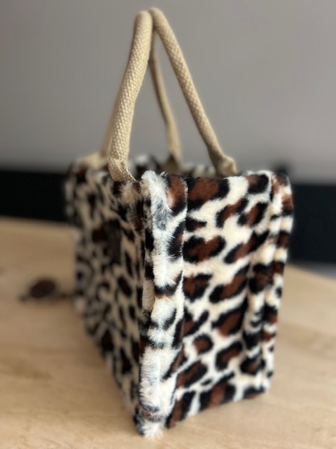 Kleine jute tas bekleed met zandkleurige fake fur panter. Een hele mooie dikke bontachtige stof in een mooie panterprint die heerlijk zacht is! Uitgevoerd met luxe katoenen gewatteerde hengsels van ±40 cm voor optimaal draagcomfort. En aan de bovenkant een drukker, zodat je het tasje dicht kan doen. Je kunt het tasje ook bv gebruiken als handtasje of lunchtasje.