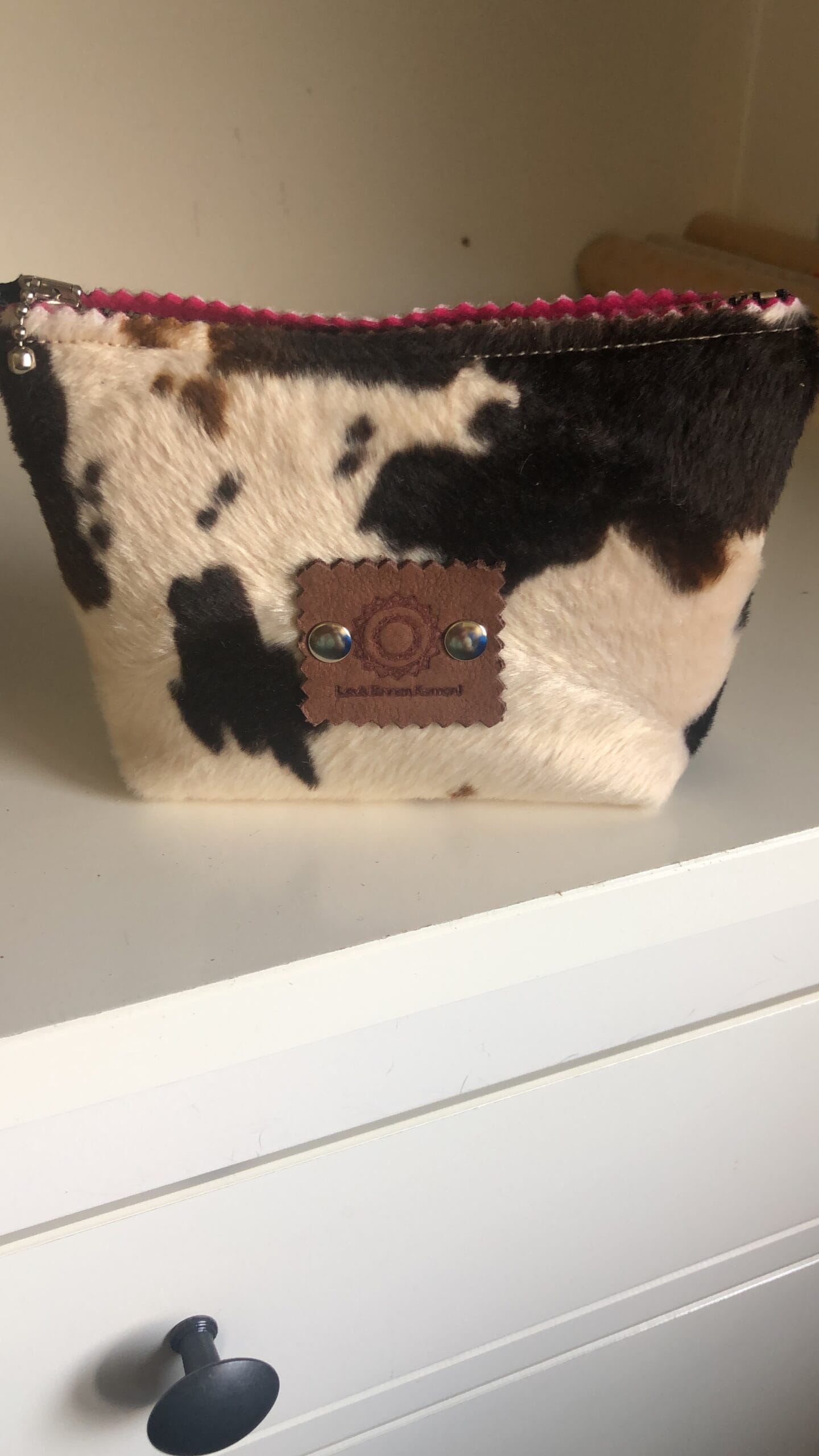 Make-up tasje met ritsje van bontachtige bruinbonte koeienprint. Aan de binnenzijde bekleed met vilt (deze kan van kleur verschillen). Dit is meestal een bijpassende kleur bij de buitenkant, maar kan ook een andere kleur zijn. Het tasje heeft aan de bovenkant een ritsje. Ook het label kan een andere kleur hebben dan op de foto. Geef in een bijgevoegde mail even aan als je een bepaalde kleur perse niet wilt. Size S, ook verkrijgbaar in M en L.