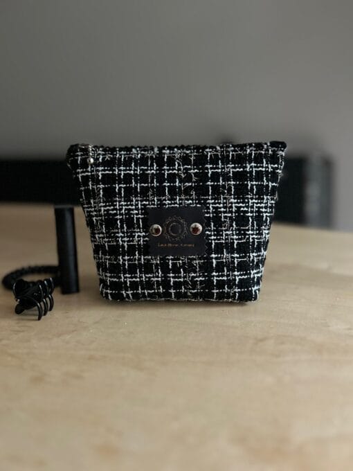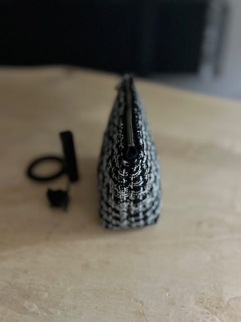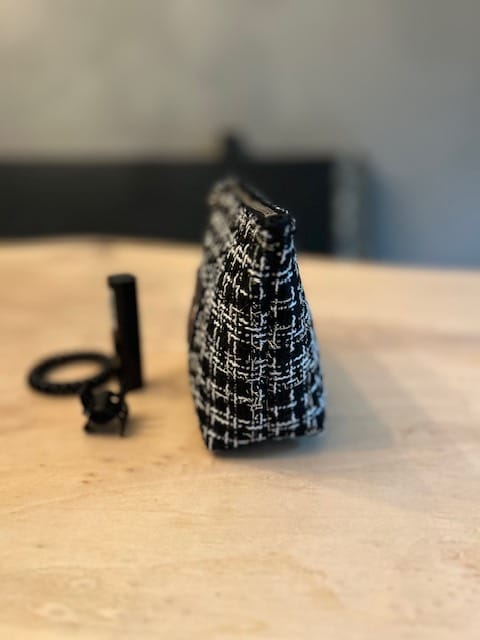 Make-up tasje met ritsje van Sjanel black met wit, en zilverdraden. Een prachtige stof die door het zilver een chique uitstraling krijgt. Aan de binnenzijde bekleed met zwart vilt, maar je kan ook voor een andere kleur kiezen. vilt,  En natuurlijk een handig ritsje. Size S  Ook verkrijgbaar in M en L