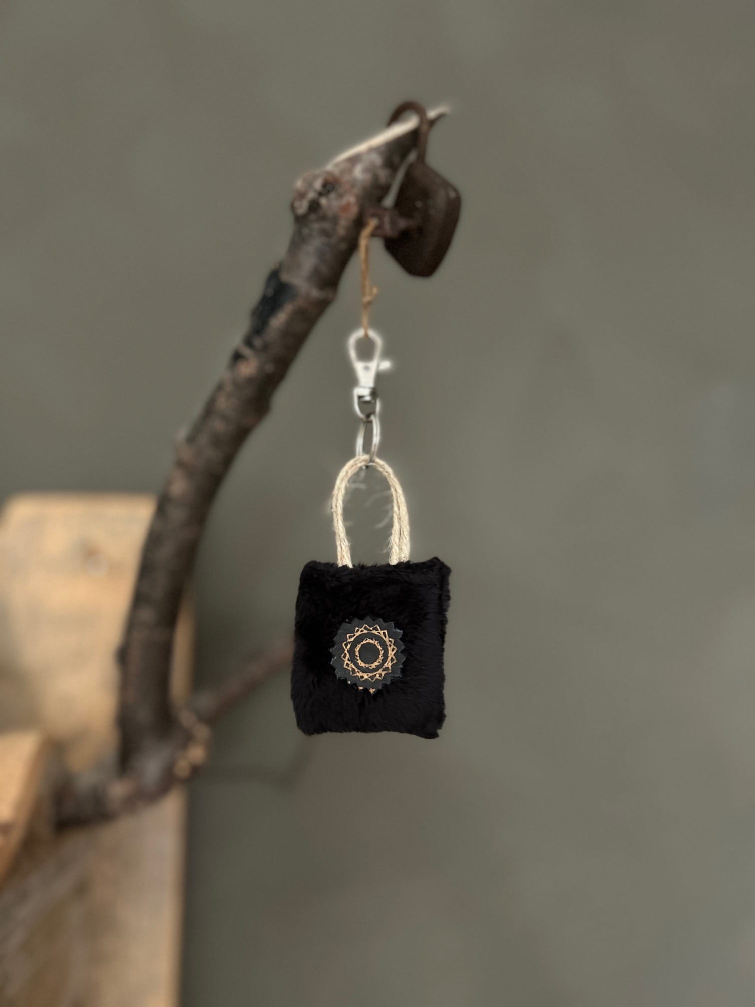Minitasje sleutelhanger van zwart cuddle fleece. Heerlijk zacht! Het tasje is opgevuld, en dicht aan de bovenkant. Met sleutelring en musketonhaak, en t hengseltje is van jute touw. Het is ongeveer 4 x 5 cm.
