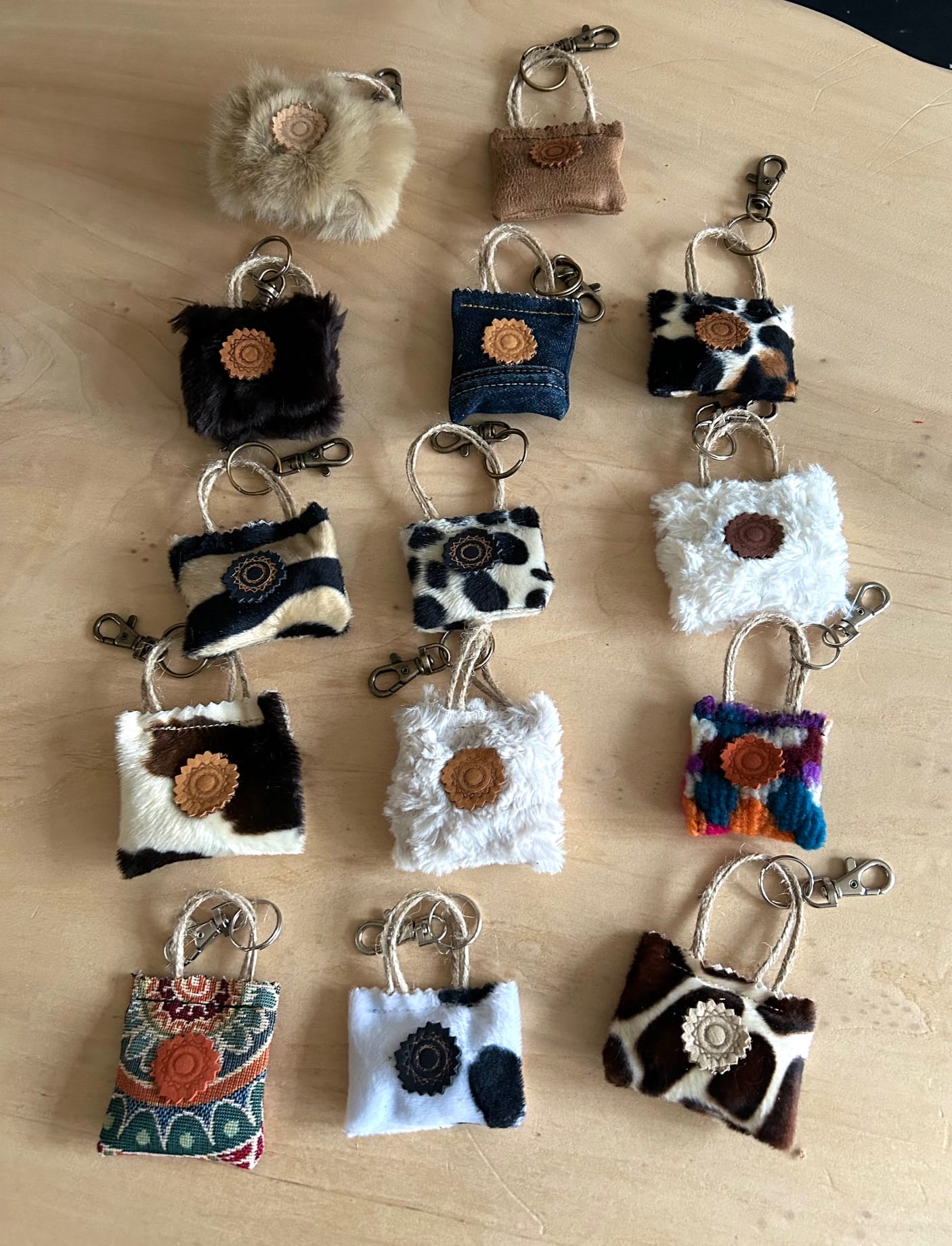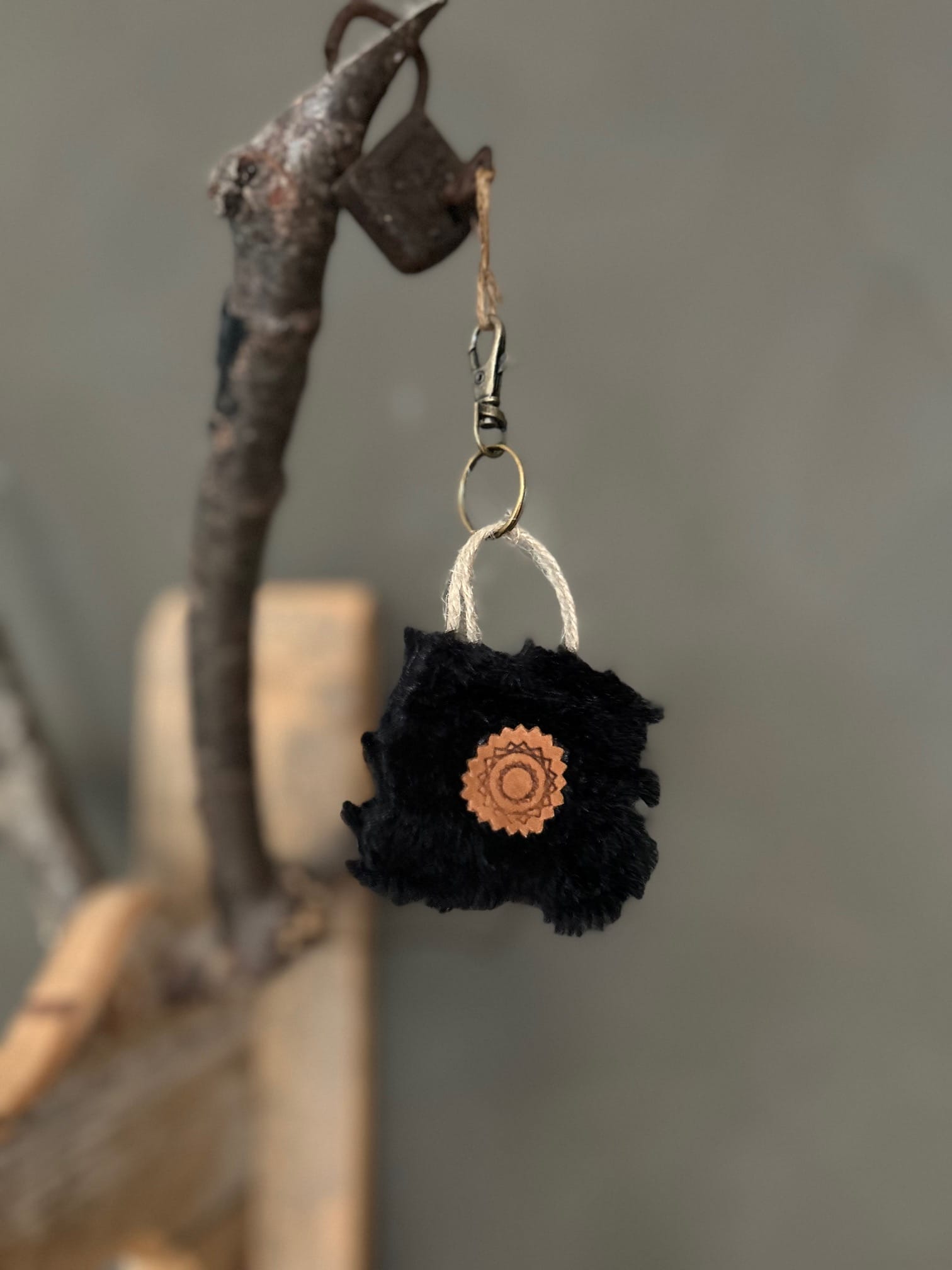 Minitasje sleutelhanger van zwart fake bont. Hij is opgevuld, en dicht aan de bovenkant. De sleutelring en musketonhaak zitten er al aan, en t hengseltje is van jute touw. Hij is ongeveer 4 x 5 cm.