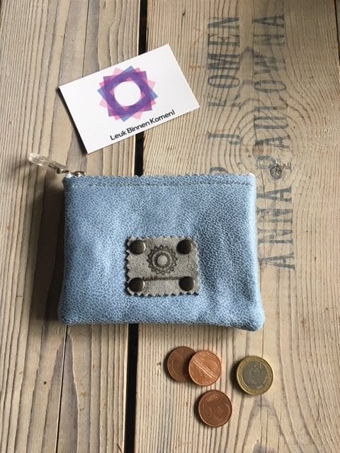 Portemonneetje met ritsje van mooie lichtblauwe leatherlook. Aan de binnenkant bekleed met vilt. Dit kunnen verschillende kleuren vilt zijn. Maar meestal een bijpassende kleur. Je kan dit handige portemonneetje ook in je handtas, kleine jute tas, of in je festivalrasje gebruiken! Neemt lekker weinig ruimte in, en je pasjes kunnen er ook makkelijk in.