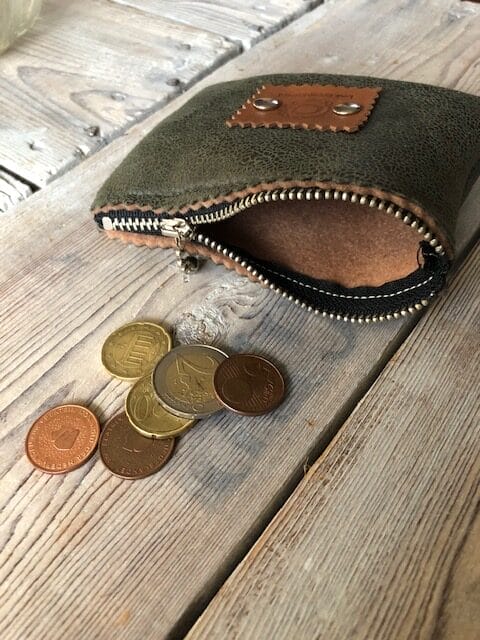 Portemonneetje met ritsje van mosgroene leatherlook. Aan de binnenkant bekleed met vilt, dit kunnen verschillende kleuren vilt zijn. Meestal passen we de kleur aan bij de stof. Maar je kunt ook een andere kleur kiezen. Geef dit aan in een bijgevoegde mail. Heel handig voor je pasjes en losse geld in je festivaltasje. Past superleuk bij de shopper of éen van de andere tasjes.