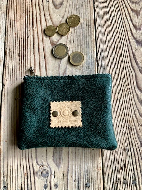 Portemonneetje met ritsje van petrolgroene leatherlook, aan de binnenkant bekleed met vilt. Aan de bovenkant zit een ritsje. Dit kunnen verschillende kleuren vilt zijn, maar we passen de kleur meestal aan bij de stof. Handig voor in een klein tasje (bv. je festivaltasje)