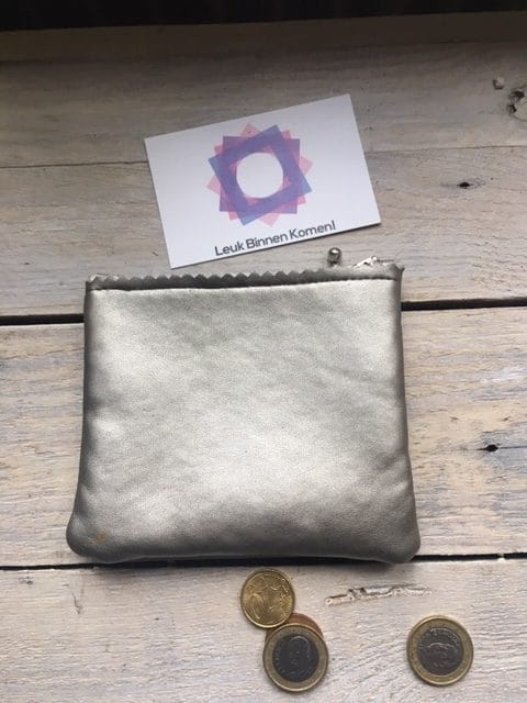 Portemonneetje met ritsje van chique zilverkleurige leatherlook, aan de binnenkant bekleed met vilt. Dit kunnen verschillende kleuren vilt zijn, maar we passen de kleur meestal aan bij de stof. Handig voor in een klein tasje(bv je festivaltasje)