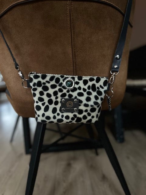 Schoudertasje van zachte cheetahprint met verstelbare leren riem. Een bontachtige stof die lekker zacht is. Het tasje is aan de binnenkant verstevigd met vilt, en heeft een rits aan de bovenkant. Je kan de riem verstellen, zodat je het tasje kan dragen als fannypack, of heuptas. Geef dan je heupmaat even door. Er is ruimte voor je telefoon, klein portemonneetje, lippenstift, en eventueel een bril. De onderkant is ongeveer 5 á 6 cm. De sleutelhanger krijg je erbij!